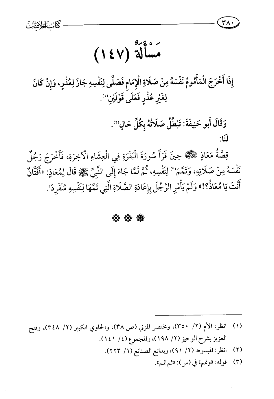 مَسْأَلَةٌ (147): إِذَا أَخْرَجَ الْمَأْمُومُ نَفْسَهُ مِنْ صَلَاةِ الْإِمَامِ فَصَلَّى لِنَفْسِهِ جَازَ لِعُذْرٍ، وَإِنْ كَانَ لِغَيْرِ عُذْرٍ فَعَلَى قَوْلَيْنِ (¬1).