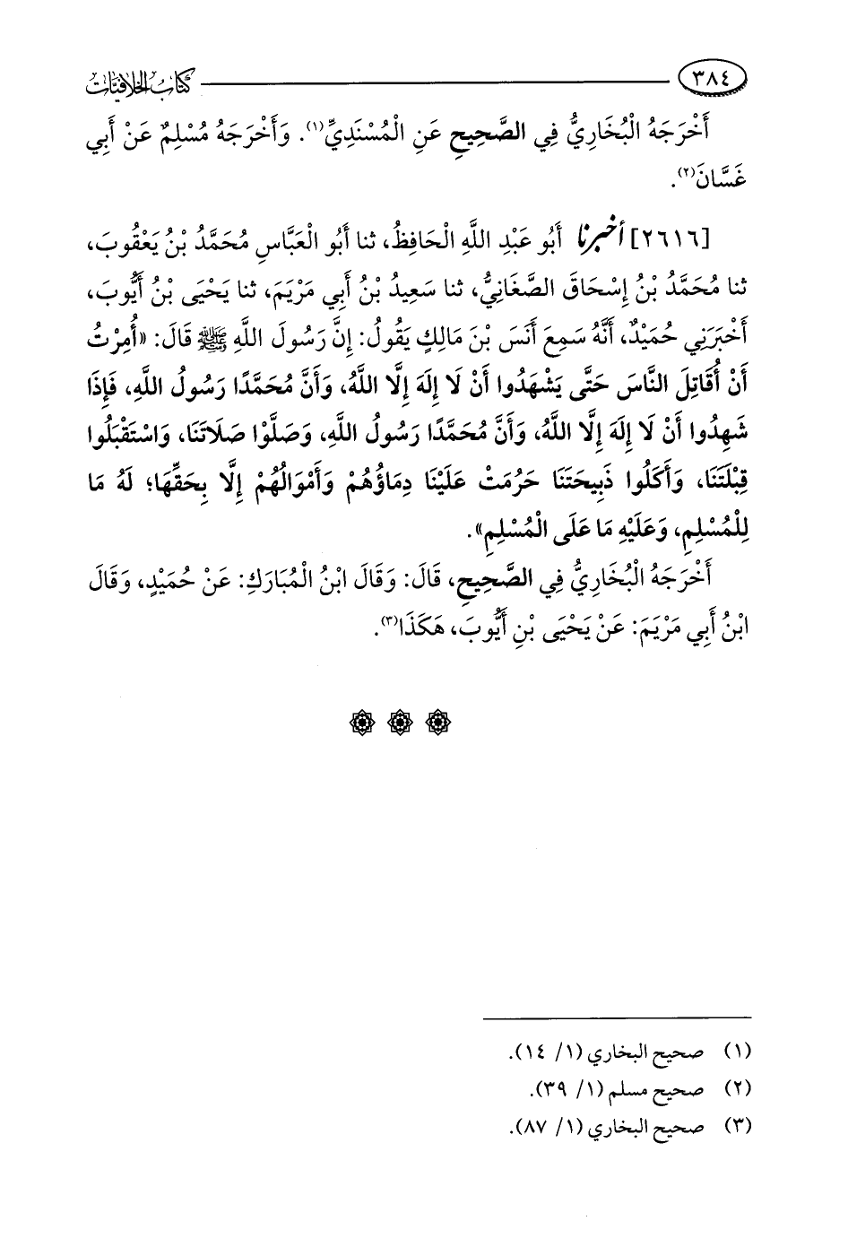 [2616] أخبرنا عَبْدِ اللَّهِ الْحَافِظُ، ثنا أَبُو الْعَبَّاسِ مُحَمَّدُ بْنُ يَعْقُوبَ، ثنا مُحَمَّدُ بْنُ إِسْحَاقَ الصَّغَانِيُّ، ثنا سَعِيدُ بْنُ أَبِي مَرْيَمَ، ثنا يَحْيَى بْنُ أَيُّوبَ، أَخْبَرَنِي حُمَيْدٌ، أَنَّهُ سَمِعَ أَنَسَ بْنَ مَالِكٍ يَقُولُ: إِنَّ رَسُولَ اللَّهِ - صلى الله عليه وسلم - قَالَ: "أُمِرْتُ أَنْ أُقَاتِلَ النَّاسَ حَتَّى يَشْهَدُوا أَنْ لَا إِلَهَ إِلَّا اللَّهُ، وَأَنَّ مُحَمَّدًا رَسُولُ اللَّهِ، فَإِذَا شَهِدُوا أَنْ لَا إِلَهَ إِلَّا اللَّهُ، وَأَنَّ مُحَمَّدًا رَسُولُ اللَّهِ، وَصَلَّوْا صَلَاتَنَا، وَاسْتَقْبَلُوا قِبْلَتَنَا، وَأَكَلُوا ذَبِيحَتَنَا حَرُمَتْ عَلَيْنَا دِمَاؤُهُمْ وَأَمْوَالُهُمْ إِلَّا بِحَقِّهَا؛ لَهُ مَا لِلْمُسْلِمِ، وَعَلَيْهِ مَا عَلَى الْمُسْلِمِ".