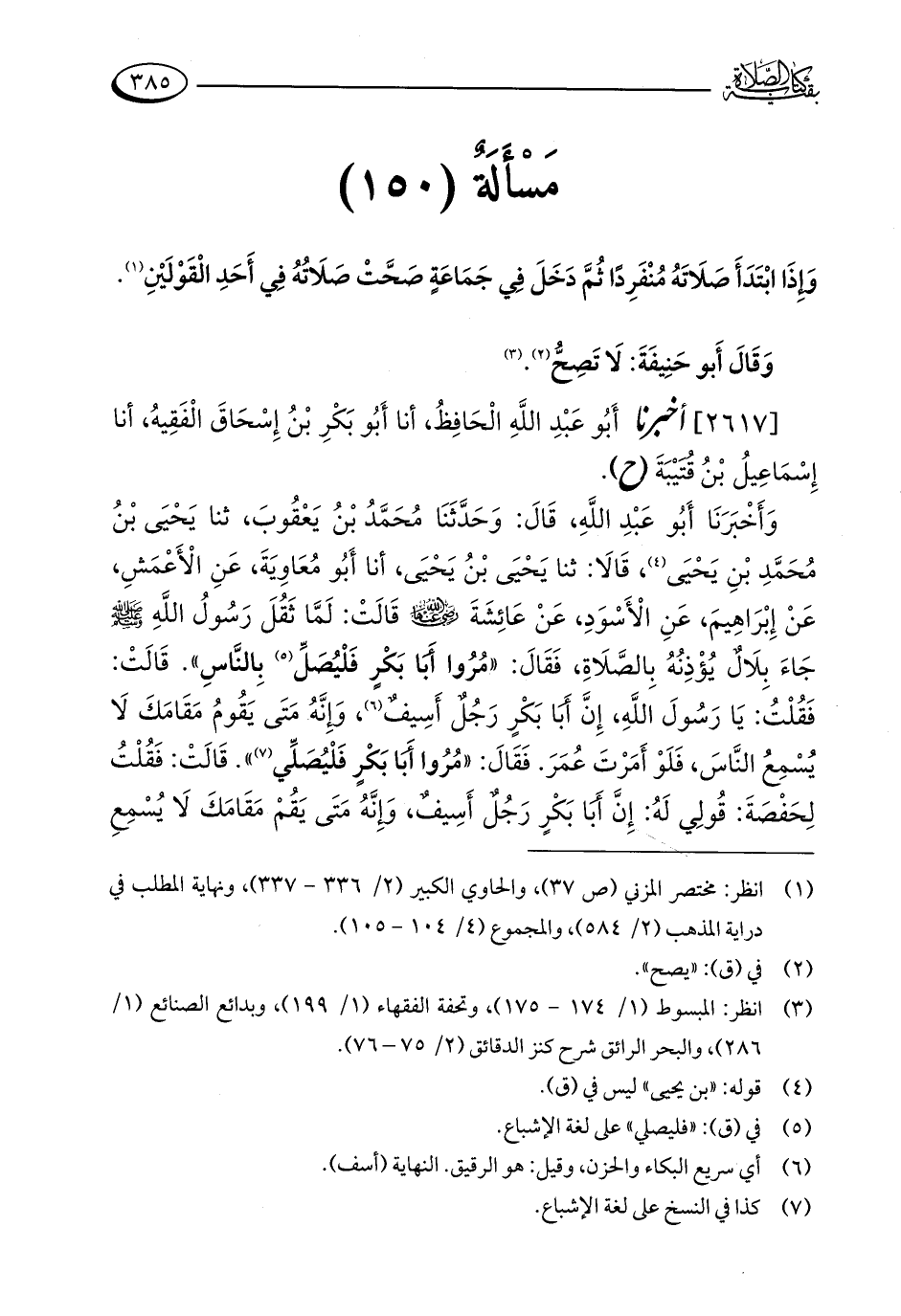 مَسْأَلَةٌ (150): وَإِذَا ابْتَدَأَ صَلَاتَهُ مُنْفَرِدًا ثُمَّ دَخَلَ فِي جَمَاعَةٍ صَحَّتْ صَلَاتُهُ فِي أَحَدِ الْقَوْلَيْنِ (¬1).