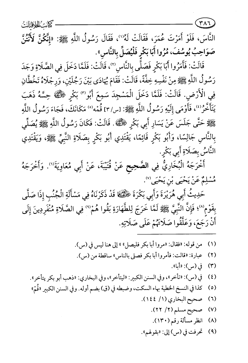 النَّاسَ، فَلَوْ أَمَرْتَ عُمَرَ، فَقَالَتْ لَهُ (¬1)، فَقَالَ رَسُولُ اللَّهِ - صلى الله عليه وسلم -: "إِنَّكُنَّ لَأَنْتُنَّ صَوَاحِبُ يُوسُفَ، مُرُوا أَبَا بَكْرٍ فَلْيُصَلِّ بِالنَّاسِ".