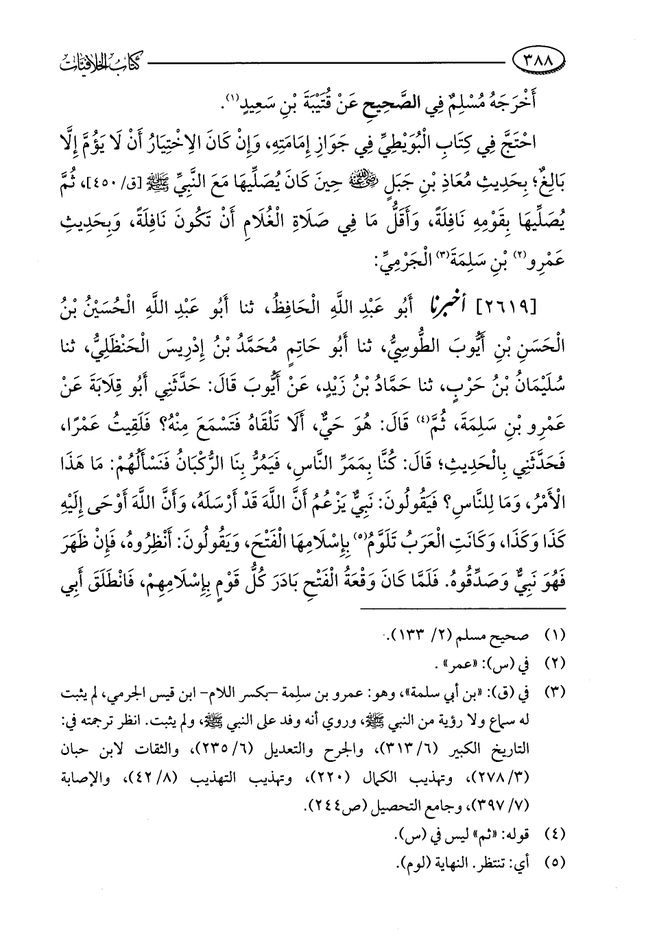 (¬3) في (ق): "بن أبي سلمة"، وهو: عمرو بن سلِمة - بكسر اللام - ابن قيس الجرمي، لم يثبت له سماع ولا رؤية من النبي - صلى الله عليه وسلم -، وروي أنه وفد على النبي - صلى الله عليه وسلم -، ولم يثبت. انظر ترجمته في: التاريخ الكبير (6/ 313)، والجرح والتعديل (6/ 235)، والثقات لابن حبان (3/ 278)، وتهذيب الكمال (220)، وتهذيب التهذيب (8/ 42)، والإصابة (7/ 397)، وجامع التحصيل (ص 244).