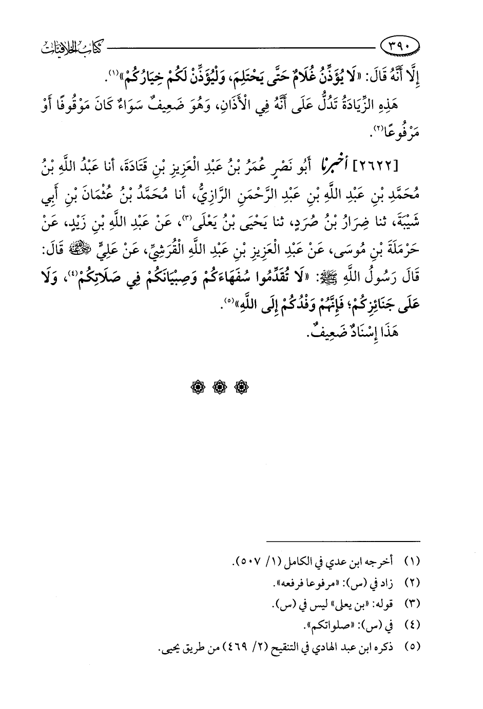 [2622] أخبرنا أَبُو نَصْرٍ عُمَرُ بْنُ عَبْدِ الْعَزِيزِ بْنِ قَتَادَةَ، أنا عَبْدُ اللَّهِ بْنُ مُحَمَّدِ بْنِ عَبْدِ اللَّهِ بْنِ عَبْدِ الرَّحْمَنِ الرَّازِيُّ، أنا مُحَمَّدُ بْنُ عُثْمَانَ بْنِ أَبِي شَيْبَةَ، ثنا ضِرَارُ بْنُ صُرَدٍ، ثنا يَحْيَى بْنُ يَعْلَى (¬3)، عَنْ عَبْدِ اللَّهِ بْنِ زَيْدٍ، عَنْ حَرْمَلَةَ بْنِ مُوسَى، عَنْ عَبْدِ الْعَزِيزِ بْنِ عَبْدِ اللَّهِ الْقُرَشِيِّ، عَنْ عَلِيٍّ - رضي الله عنه - قَالَ: قَالَ رَسُولُ اللَّهِ - صلى الله عليه وسلم -: "لَا تُقَدِّمُوا سُفَهَاءَكُمْ وَصِبْيَانَكُمْ فِي صَلَاتِكُمْ (¬4)، وَلَا عَلَى جَنَائِزِكُمْ؛ فَإِنَّهُمْ وَفْدُكُمْ إِلَى اللَّهِ" (¬5).
