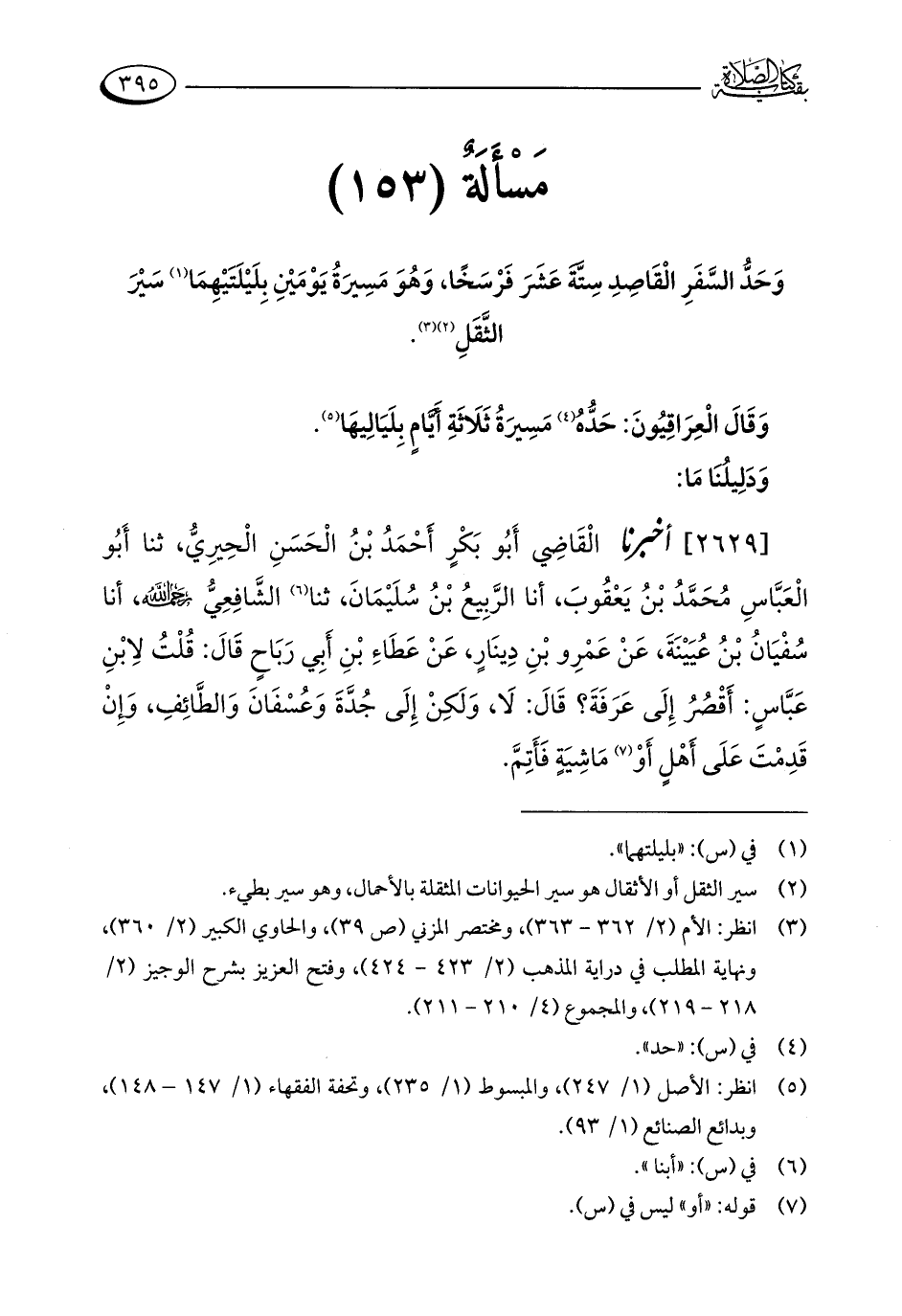 مَسْأَلَةٌ (153): وَحَدُّ السَّفَرِ الْقَاصِدِ سِتَّةَ عَشَرَ فَرْسَخًا، وَهُوَ مَسِيرَةُ يَوْمَيْنِ بِلَيْلَتَيْهِمَا (¬1) سَيْرَ الثَّقَلِ (¬2) (¬3).