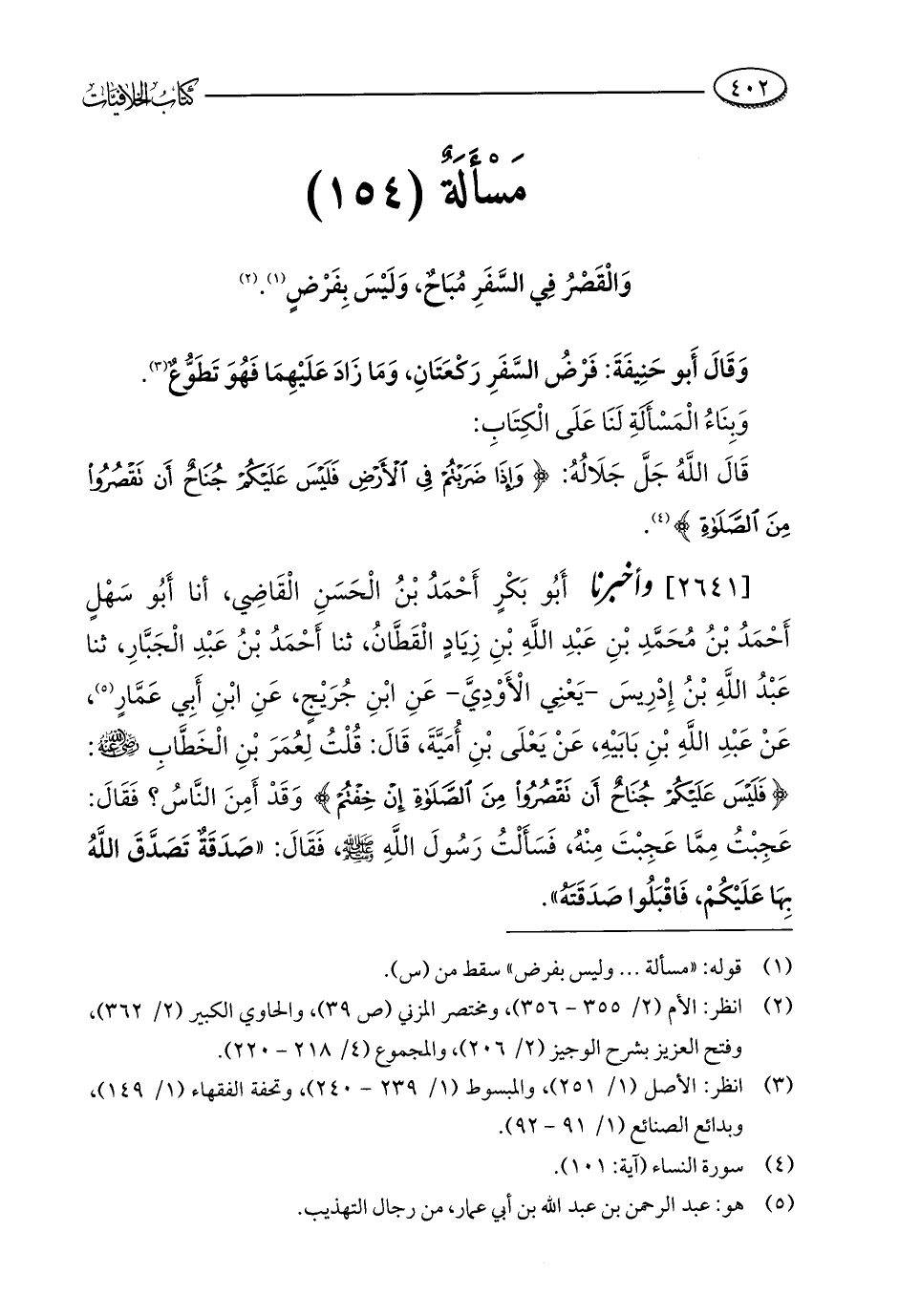 مَسْأَلَةٌ (154): وَالْقَصْرُ فِي السَّفَرِ مُبَاحٌ، وَلَيْسَ بِفَرْضٍ (¬1). (¬2)