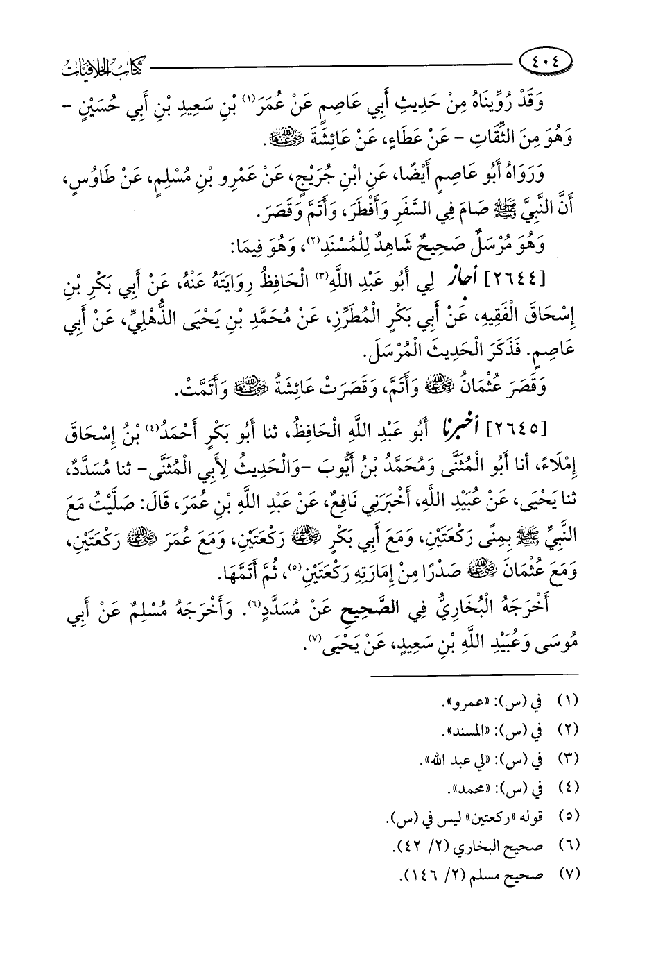 [2645] أخبرنا أَبُو عَبْدِ اللَّهِ الْحَافِظُ، ثنا أَبُو بَكْرٍ أَحْمَدُ (¬4) بْنُ إِسْحَاقَ إِمْلَاءً، أنا أَبُو الْمُثَنَّى وَمُحَمَّدُ بْنُ أَيُّوبَ - وَالْحَدِيثُ لِأَبِي الْمُثَنَّى - ثنا مُسَدَّدٌ، ثنا يَحْيَى، عَنْ عُبَيْدِ اللَّهِ، أَخْبَرَنِي نَافِعٌ، عَنْ عَبْدِ اللَّهِ بْنِ عُمَرَ، قَالَ: صَلَّيْتُ مَعَ النَّبِيِّ - صلى الله عليه وسلم - بِمِنًى رَكْعَتَيْنِ، وَمَعَ أَبِي بَكْرٍ - رضي الله عنه - رَكْعَتَيْنِ، وَمَعَ عُمَرَ - رضي الله عنه - رَكْعَتَيْنِ، وَمَعَ عُثْمَانَ - رضي الله عنه - صَدْرًا مِنْ إِمَارَتِهِ رَكْعَتَيْنِ (¬5)، ثُمَّ أَتَمَّهَا.