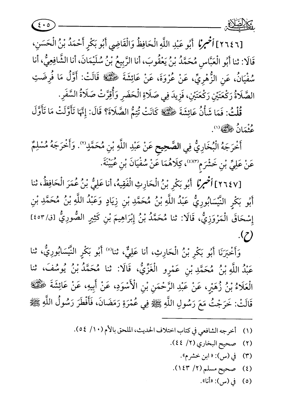 [2646] أخبرنا أَبُو عَبْدِ اللَّهِ الْحَافِظُ وَالْقَاضِي أَبُو بَكْرٍ أَحْمَدُ بْنُ الْحَسَنِ، قَالَا: ثنا أَبُو الْعَبَّاسِ مُحَمَّدُ بْنُ يَعْقُوبَ، أنا الرَّبِيعُ بْنُ سُلَيْمَانَ، أنا الشَّافِعِيُّ، أنا سُفْيَانُ، عَنِ الزُّهْرِيِّ، عَنْ عُرْوَةَ، عَنْ عَائِشَةَ - رضي الله عنها - قَالَتْ: أَوَّلُ مَا فُرِضَتِ الصَّلَاةُ رَكْعَتَيْنِ رَكْعَتَيْنِ، فَزِيدَ فِي صَلَاةِ الْحَضَرِ وَأُقِرَّتْ صَلَاةُ السَّفَرِ.