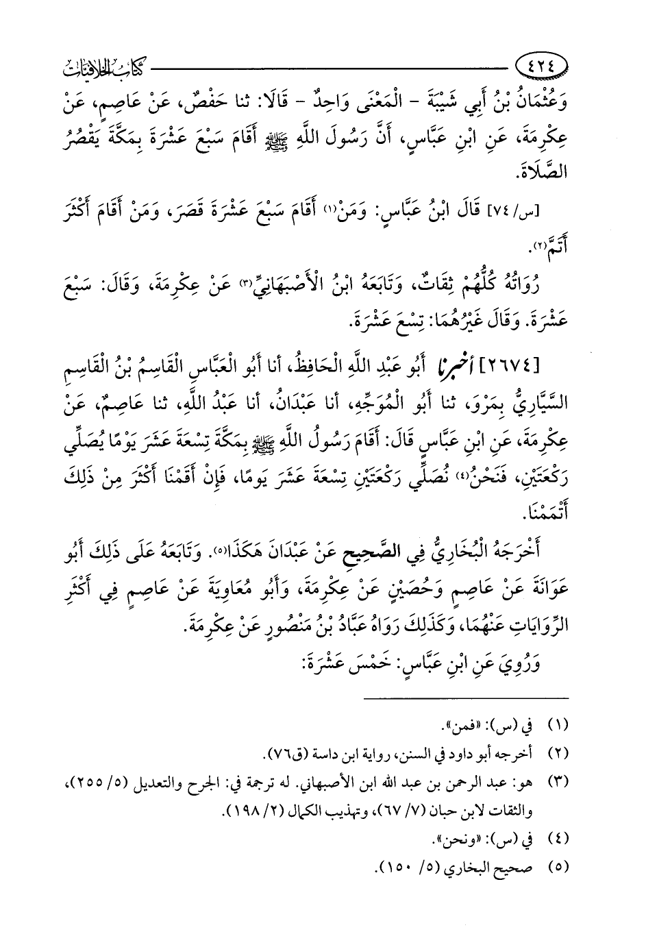 [2674] أخبرنا أَبُو عَبْدِ اللَّهِ الْحَافِظُ، أنا أَبُو الْعَبَّاسِ الْقَاسِمُ بْنُ الْقَاسِمِ السَّيَّارِيُّ بِمَرْوَ، ثنا أَبُو الْمُوَجِّهِ، أنا عَبْدَانُ، أنا عَبْدُ اللَّهِ، ثنا عَاصِمٌ، عَنْ عِكْرِمَةَ، عَنِ ابْنِ عَبَّاسٍ قَالَ: أَقَامَ رَسُولُ اللَّهِ - صلى الله عليه وسلم - بِمَكَّةَ تِسْعَةَ عَشَرَ يَوْمًا يُصَلِّي رَكْعَتَيْنِ، فَنَحْنُ (¬4) نُصَلِّي رَكْعَتَيْنِ تِسْعَةَ عَشَرَ يَومًا، فَإِنْ أَقَمْنَا أَكْثَرَ مِنْ ذَلِكَ أَتْمَمْنَا.