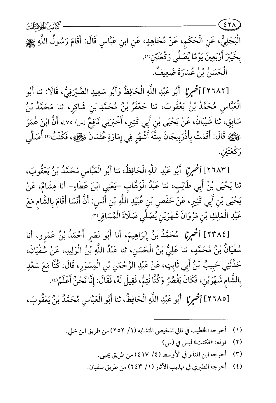 [2682] أخبرنا أَبُو عَبْدِ اللَّهِ الْحَافِظُ وَأَبُو سَعِيدٍ الصَّيْرَفِيُّ, قَالَا: ثنا أَبُو الْعَبَّاسِ مُحَمَّدُ بْنُ يَعْقُوبَ، ثنا جَعْفَرُ بْنُ مُحَمَّدِ بْنِ شَاكِرٍ, ثنا مُحَمَّدُ بْنُ سَابِقٍ، ثنا شَيْبَانُ، عَنْ يَحْيَى بْنِ أَبِي كَثِيرٍ، أَخْبَرَنِي نَافِعٌ, أَنَّ ابْنَ عُمَرَ - رضي الله عنه - قَالَ: أَقَمْتُ بِأَذْرَبِيجَانَ سِتَّةَ أَشْهُرٍ فِي إِمَارَةِ عُثْمَانَ - رضي الله عنه -, فَكُنْتُ (¬2) أُصَلِّي رَكْعَتَيْنِ.