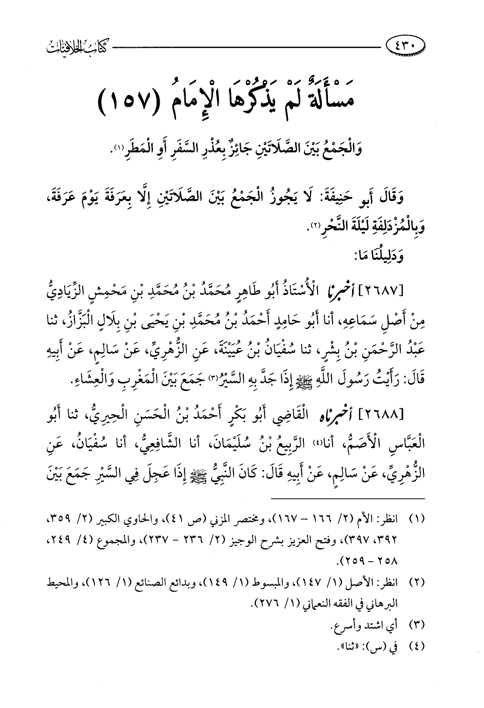 مَسْأَلَةٌ لَمْ يَذْكُرْهَا الْإِمَامُ (157): وَالْجَمْعُ بَيْنَ الصَّلَاتَيْنِ جَائِزٌ بِعُذْرِ السَّفَرِ أَوِ الْمَطَرِ (¬1).