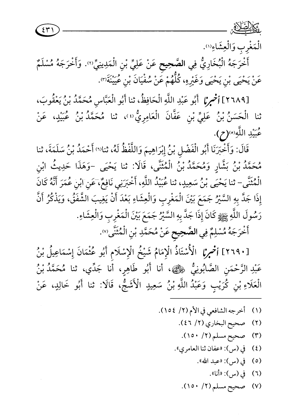 قَالَ: وَأَخْبَرَنَا أَبُو الْفَضْلِ بْنُ إِبْرَاهِيمَ وَاللَّفْظُ لَهُ، ثنا (¬6) أَحْمَدُ بْنُ سَلَمَةَ، ثنا مُحَمَّدُ بْنُ بَشَّارٍ وَمُحَمَّدُ بْنُ الْمُثَنَّى، قَالَا: ثنا يَحْيَى - وَهَذَا حَدِيثُ ابْنِ الْمُثَنَّى - ثنا يَحْيَى بْنُ سَعِيدٍ، ثنا عُبَيْدُ اللَّهِ، أَخْبَرَنِي نَافِعٌ، عَنِ ابْنِ عُمَرَ أَنَّهُ كَانَ إِذَا جَدَّ بِهِ السَّيْرُ جَمَعَ بَيْنَ الْمَغْرِبِ وَالْعِشَاءِ بَعْدَ أَنْ يَغِيبَ الشَّفَقُ، وَيَذْكُرُ أَنَّ رَسُولَ اللَّهِ - صلى الله عليه وسلم - كَانَ إِذَا جَدَّ بِهِ السَّيْرُ جَمَعَ بَيْنَ الْمَغْرِبِ وَالْعِشَاءِ.