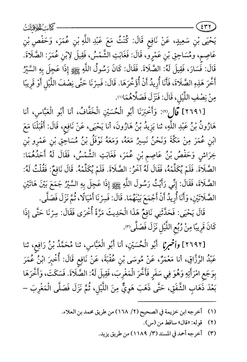[2691] قال (¬2): وَأَخْبَرَنَا أَبُو الْحُسَيْنِ الْخَفَّافُ، أنا أَبُو الْعَبَّاسِ، أنا هَارُونُ بْنُ عَبْدِ اللَّهِ، ثنا يَزِيدُ بْنُ هَارُونَ، أنا يَحْيَى، عَنْ نَافِعٍ، قَالَ: أَقْبَلْنَا مَعَ ابْنِ عُمَرَ مِنْ مَكَّةَ وَنَحْنُ نَسِيرُ مَعَهُ، وَمَعَهُ نَوْفَلُ بْنُ مُسَاحِقِ بْنِ عَمْرِو بْنِ خِرَاشٍ وَحَفْصُ بْنُ عَاصِمِ بْنِ عُمَرَ، فَغَابَتِ الشَّمْسُ، فَقَالَ لَهُ أَحَدُهُمَا: الصَّلَاةَ. فَلَمْ يُكَلِّمْهُ، فَقَالَ لَهُ آخَرُ: الصَّلَاةَ. فَلَمْ يُكَلِّمْهُ. قَالَ نَافِعٌ: فَقُلْتُ لَهُ: الصَّلَاةَ، فَقَالَ: إِنِّي رَأَيْتُ رَسُولَ اللَّهِ - صلى الله عليه وسلم - إِذَا عَجِلَ بِهِ السَّيْرُ جَمَعَ بَيْنَ هَاتَيْنِ الصَّلَاتَيْنِ، وَأَنَا أُرِيدُ أَنْ أَجْمَعَ بَيْنَهُمَا. قَالَ: فَسِرْنَا أَمْيَالًا، ثُمَّ نَزَلَ فَصَلَّى.