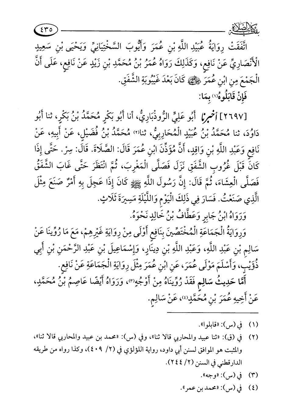 اتَّفَقَتْ رِوَايَةُ عُبَيْدِ اللَّهِ بْنِ عُمَرَ وَأَيُّوبَ السَّخْتِيَانِيِّ وَيَحْيَى بْنِ سَعِيدٍ الْأَنْصَارِيِّ عَنْ نَافِعٍ، وَكَذَلِكَ رَوَاهُ عُمَرُ بْنُ مُحَمَّدِ بْنِ زَيْدٍ عَنْ نَافِعٍ، عَلَى أَنَّ الْجَمْعَ مِنِ ابْنِ عُمَرَ - رضي الله عنه - كَانَ بَعْدَ غَيْبُوبَةِ الشَّفَقِ.