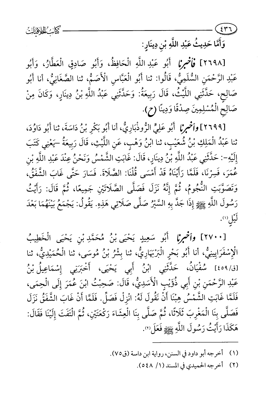 [2699] وأخبرنا أَبُو عَلِيٍّ الرُّوذْبَارِيُّ، أنا أَبُو بَكْرِ بْنُ دَاسَةَ، ثنا أَبُو دَاوُدَ، ثنا عَبْدُ الْمَلِكِ بْنُ شُعَيْبٍ، ثنا ابْنُ وَهْبٍ، عَنِ اللَّيْثِ، قَالَ رَبِيعَةُ - يَعْنِي كَتَبَ إِلَيْهِ -: حَدَّثَنِي عَبْدُ اللَّهِ بْنُ دِينَارٍ، قَالَ: غَابَتِ الشَّمْسُ وَنَحْنُ عِنْدَ عَبْدِ اللَّهِ بْنِ عُمَرَ، فَسِرْنَا، فَلَمَّا رَأَيْنَاهُ قَدْ أَمْسَى قُلْنَا: الصَّلَاةَ. فَسَارَ حَتَّى غَابَ الشَّفَقُ، وَتَصَوَّبَتِ النُّجُومُ، ثُمَّ إِنَّهُ نَزَلَ فَصَلَّى الصَّلَاتَيْنِ جَمِيعًا، ثُمَّ قَالَ: رَأَيْتُ رَسُولَ اللَّهِ - صلى الله عليه وسلم - إِذَا جَدَّ بِهِ السَّيْرُ صَلَّى صَلَاتِي هَذِهِ. يَقُولُ: يَجْمَعُ بَيْنَهُمَا بَعْدَ لَيْلٍ (¬1).