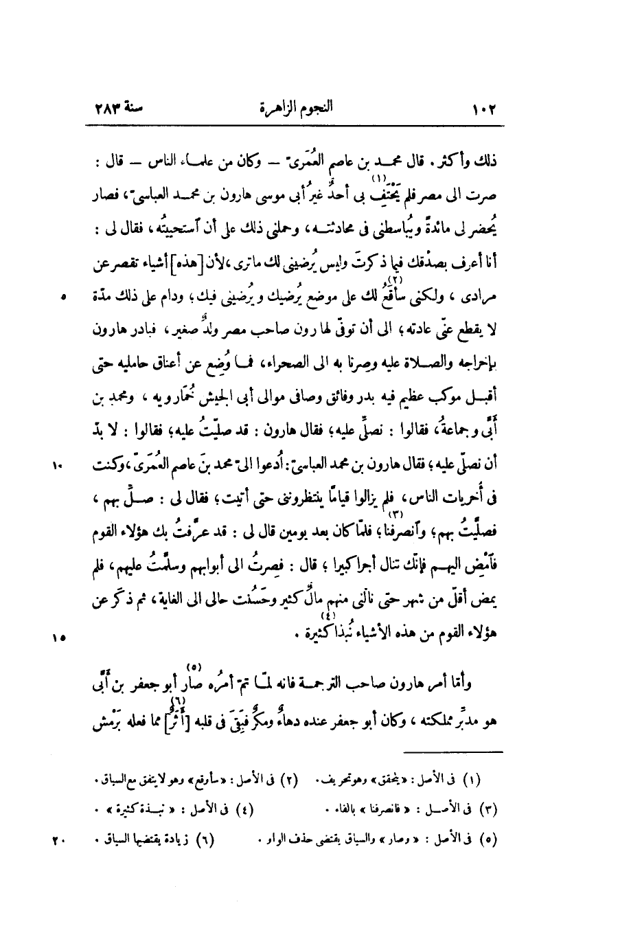 أنا أعرف بصدقك فيما ذكرت وليس يرضينى لك ما ترى، لأن [هذه] أشياء تقصر عن مرادى، ولكنى سأقع «2» لك على موضع يرضيك ويرضينى فيك؛ ودام على ذلك مدّة لا يقطع عنّى عادته؛ الى أن توفّى لها رون صاحب مصر ولد صغير، فبادر هارون بإخراجه والصلاة عليه وصرنا به الى الصحراء، فما وضع عن أعناق حامليه حتى أقبل موكب عظيم فيه بدر وفائق وصافى موالى أبى الجيش خمارويه، ومحمد بن أبّى وجماعة، فقالوا: نصلّى عليه؛ فقال هارون: قد صلّيت عليه؛ فقالوا: لا بدّ أن نصلّى عليه؛ فقال هارون بن محمد العباسىّ: ادعوا الىّ محمد بن عاصم العمرىّ، وكنت فى أخريات الناس، فلم يزالوا قياما ينتظروننى حتى أتيت؛ فقال لى: صلّ بهم، فصلّيت بهم؛ وانصرفنا «3» ؛ فلمّا كان بعد يومين قال لى: قد عرّفت بك هؤلاء القوم فامض اليهم فإنّك تنال أجرا كبيرا؛ قال: فصرت الى أبوابهم وسلّمت عليهم، فلم يمض أقلّ من شهر حتى نالنى منهم مال كثير وحسنت حالى الى الغاية، ثم ذكر عن هؤلاء القوم من هذه الأشياء نبذا «4» كثيرة.