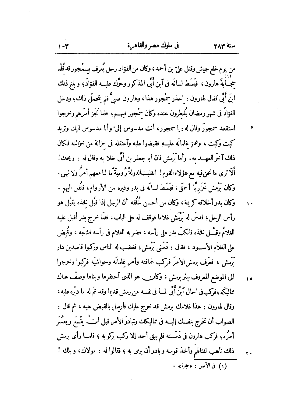 الصواب أن تخرج بنفسك إليه في مماليكك وتبادر الأمر قبل أن يتّسع ويعسر أمره؛ فركب هارون في دسته فلم يبق أحد إلا ركب بركوبه؛ فلما رأى برمش ذلك تأهب لقتالهم وأخذ قوسه وبادر أن يرمى به؛ فقالوا له: مولاك، ويلك!