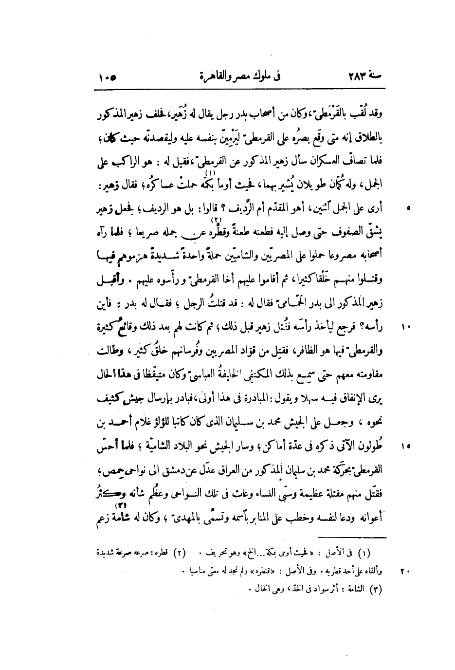 أرى على الجمل اثنين، أهو المقدّم أم الرّديف؟ قالوا: بل هو الرديف؛ فجعل زهير يشقّ الصفوف حتى وصل إليه فطعنه طعنة وقطّره «2» عن جمله صريعا؛ فلما رآه أصحابه مصروعا حملوا على المصريّين والشاميّين حملة واحدة شديدة هزموهم فيها وقتلوا منهم خلقا كثيرا، ثم أقاموا عليهم أخا القرمطىّ ورأّسوه عليهم. وأقبل زهير المذكور الى بدر الحمّامىّ فقال له: قد قتلت الرجل؛ فقال له بدر: فأين رأسه؟ فرجع ليأخذ رأسه فقتل زهير قبل ذلك؛ ثم كانت لهم بعد ذلك وقائع كثيرة والقرمطىّ فيها هو الظافر، فقتل من قوّاد المصريين وفرسانهم خلق كثير، وطالت مقاومته معهم حتى سمع بذلك المكتفى الخليفة العباسىّ وكان متيقّظا في هذا الحال يرى الإنفاق فيه سهلا ويقول: المبادرة في هذا أولى، فبادر بإرسال جيش كثيف نحوه، وجعل على الجيش محمد بن سليمان الذي كان كاتبا للؤلؤ غلام أحمد بن طولون الآتى ذكره في عدّة أماكن؛ وسار الجيش نحو البلاد الشاميّة؛ فلما أحسّ القرمطىّ بحركة محمد بن سليمان المذكور من العراق عدل عن دمشق الى نواحى حمص؛ فقتل منهم مقتلة عظيمة وسبى النساء وعاث في تلك النواحى وعظم شأنه وكثر أعوانه ودعا لنفسه وخطب على المنابر باسمه وتسمّى بالمهدىّ؛ وكان له شامة «3» زعم