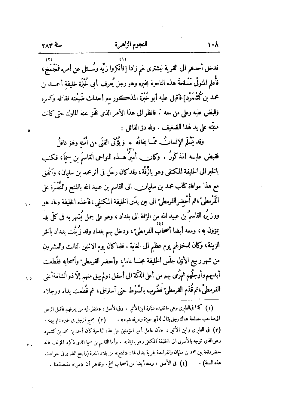 فقبض عليه المذكور. وكان أمير «3» هذه النواحى القاسم بن سيما، فكتب بالخبر الى الخليفة المكتفى وهو بالرّقّة، وقد كان رحل في أثر محمد بن سليمان، واتّفق مع هذا موافاة كتاب محمد بن سليمان الى القاسم بن عبيد الله بالفتح والنّصرة على القرمطىّ، ثم أحضر القرمطىّ الى بين يدى الخليفة المكتفى، فأخذه الخليفة وعاد هو ووزيره القاسم بن عبيد الله من الرّقة الى بغداد، وهو على جمل يشهر به في كلّ بلد يمرّون به، ومعه أيضا أصحاب «4» القرمطىّ، ودخل بهم بغداد وقد زيّنت بغداد بأفخر الزينة، وكان لدخولهم يوم عظيم الى الغاية. فلما كان يوم الاثنين الثالث والعشرون من شهر ربيع الأوّل جلس الخليفة مجلسا عاما، وأحضر القرمطىّ وأصحابه فقطعت أيديهم وأرجلهم ثم رمى بهم من أعلى الدكّة الى أسفل، ولم يبق منهم إلّا ذو الشامة أعنى القرمطىّ، ثم قدّم القرمطىّ فضرب بالسّوط حتى استرخى، ثم قطعت يداه ورجلاه