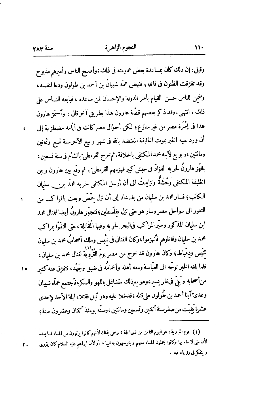 وقيل: إن ذلك كان بمساعدة بعض عمومته في ذلك، وأصبح الناس وأميرهم مذبوح وقد تفرّقت الظنون في قاتله؛ فنهض عمّه شيبان بن أحمد بن طولون ودعا لنفسه، وضمن للناس حسن القيام بأمر الدولة والإحسان لمن ساعده، فبايعه الناس على ذلك. انتهى. وقد ذكر بعضهم قصّة هارون هذا بطريق آخر قال: واستمرّ هارون هذا في إمرة مصر من غير منازع؛ لكن أحوال مصر كانت في أيّامه مضطربة إلى أن ورد عليه الخبر بموت الخليفة المعتضد بالله في شهر ربيع الآخر سنة تسع وثمانين ومائتين، وبويع لابنه محمد المكتفى بالخلافة. ثم خرج القرمطىّ بالشأم في سنة تسعين، فجهّز هارون لحربه القوّاد في جيش كبير فهزمهم القرمطىّ؛ ثم وقع بين هارون وبين الخليفة المكتفى وحشة وتزايدت الى أن أرسل المكتفى لحربه محمد بن سليمان الكاتب؛ فسار محمد بن سليمان من بغداد إلى أن نزل حمص وبعث بالمراكب من الثغور الى سواحل مصر وسار هو حتى نزل بفلسطين؛ فتجهّز هارون أيضا لقتال محمد ابن سليمان المذكور وسيّر المراكب في البحر لحربه وفيها المقاتلة، حتى التقوا بمراكب محمد بن سليمان وقاتلوهم فانهزموا؛ وكان القتال في تنّيس وملك أصحاب محمد بن سليمان تنّيس ودمياط؛ وكان هارون قد خرج من مصر يوم التّروية «1» لقتال محمد بن سليمان، فلما بلغه الخبر توجّه الى العبّاسة ومعه أهله وأعمامه في ضيق وجهد، فتفرّق عنه كثير من أصحابه وبقى في نفر يسير، وهو مع ذلك متشاغل باللهو والسكر؛ فاجتمع عمّاه شيبان وعدىّ ابنا أحمد بن طولون على قتله، فدخلا عليه وهو ثمل فقتلاه ليلة الأحد لإحدى عشرة بقيت من صفر سنة اثنتين وتسعين ومائتين، وسنّه يومئذ اثنتان وعشرون سنة؛