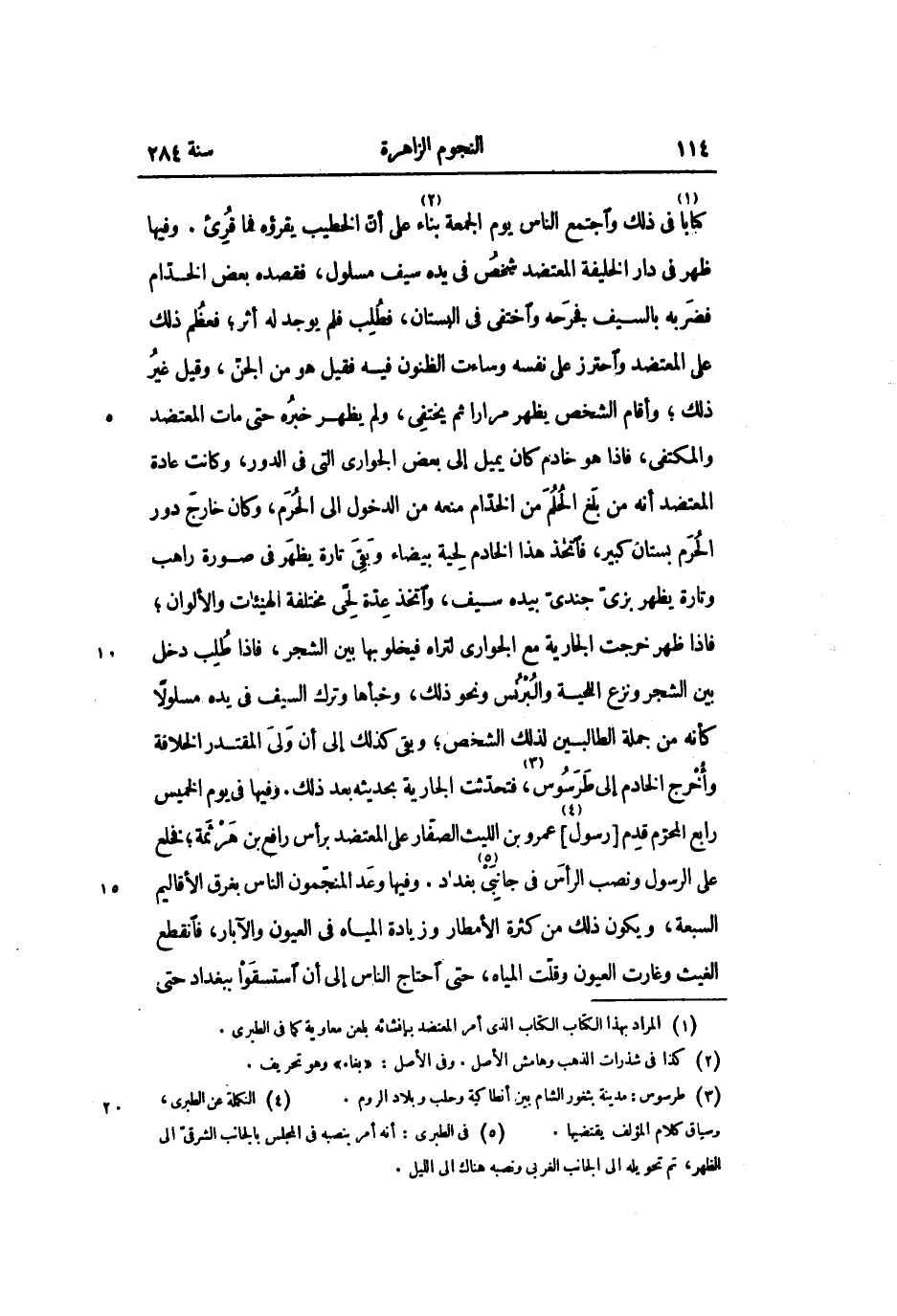 كتابا «1» فى ذلك واجتمع الناس يوم الجمعة بناء «2» على أنّ الخطيب يقرؤه فما قرئ. وفيها ظهر في دار الخليفة المعتضد شخص في يده سيف مسلول، فقصده بعض الخدّام فضربه بالسيف فجرحه واختفى في البستان، فطلب فلم يوجد له أثر؛ فعظم ذلك على المعتضد واحترز على نفسه وساءت الظنون فيه فقيل هو من الجنّ، وقيل غير ذلك؛ وأقام الشخص يظهر مرارا ثم يختفى، ولم يظهر خبره حتى مات المعتضد والمكتفى، فاذا هو خادم كان يميل إلى بعض الجوارى التى في الدور، وكانت عادة المعتضد أنه من بلغ الحلم من الخدّام منعه من الدخول الى الحرم، وكان خارج دور الحرم بستان كبير، فاتخذ هذا الخادم لحية بيضاء وبقى تارة يظهر في صورة راهب وتارة يظهر بزىّ جندىّ بيده سيف، واتخذ عدّة لحّى مختلفة الهيئات والألوان؛ فاذا ظهر خرجت الجارية مع الجوارى لتراه فيخلو بها بين الشجر، فاذا طلب دخل بين الشجر ونزع اللحية والبرنس ونحو ذلك، وخبأها وترك السيف في يده مسلولا كأنه من جملة الطالبين لذلك الشخص؛ وبقى كذلك إلى أن ولى المقتدر الخلافة وأخرج الخادم إلى طرسوس «3» ، فتحدّثت الجارية بحديثه بعد ذلك. وفيها في يوم الخميس رابع المحرّم قدم [رسول «4» ] عمرو بن الليث الصفّار على المعتضد برأس رافع بن هرثمة؛ فخلع على الرسول ونصب الرأس في جانبى «5» بغداد. وفيها وعد المنجّمون الناس بغرق الأقاليم السبعة، ويكون ذلك من كثرة الأمطار وزيادة المياه في العيون والآبار، فانقطع الغيث وغارت العيون وقلّت المياه، حتى احتاج الناس إلى أن استسقوا ببغداد حتى
