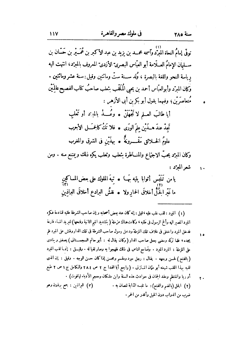 توفّى إمام النحاة المبرّد «1» واسمه محمد بن يزيد بن عبد الأكبر بن عمير بن حسّان بن سليمان الإمام العلّامة أبو العبّاس البصرىّ الأزدىّ المعروف بالمبرّد، انتهت إليه رياسة النحو واللغة بالبصرة، ولد سنة ستّ ومائتين وقيل: سنة عشر ومائتين.
