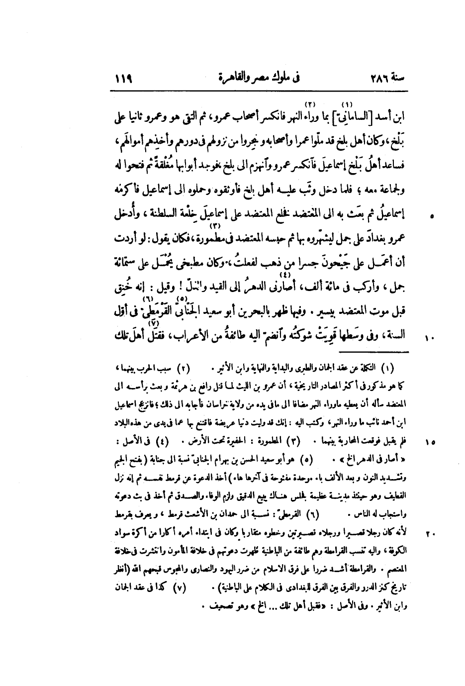 ابن أسد [السامانىّ «1» ] بما وراء «2» النهر فانكسر أصحاب عمرو، ثم التقى هو وعمرو ثانيا على بلخ، وكان أهل بلخ قد ملّوا عمرا وأصحابه ونجروا من نزولهم في دورهم وأخذهم أموالهم، فساعد أهل بلخ إسماعيل فانكسر عمرو وانهزم الى بلخ، فوجد أبوابها مغلقة ثم فتحوا له ولجماعة معه؛ فلما دخل وثب عليه أهل بلخ فأوثقوه وحملوه الى إسماعيل فأكرمه إسماعيل ثم بعث به الى المعتضد فخلع المعتضد على إسماعيل خلعة السلطنة، وأدخل عمرو بغداد على جمل ليشهّروه بها ثم حبسه المعتضد في مطمورة «3» ، فكان يقول: لو أردت أن أعمل على جيحون جسرا من ذهب لفعلت، وكان مطبخى يحمل على ستمائة جمل، وأركب في مائة ألف، أصارنى «4» الدهر إلى القيد والذلّ! وقيل: إنه خنق قبل موت المعتضد بيسير. وفيها ظهر بالبحرين أبو سعيد الجنّابىّ «5» القرمطىّ «6» في أوّل السنة، وفي وسطها قويت شوكته وانضمّ إليه طائفة من الأعراب، فقتل «7» أهل تلك