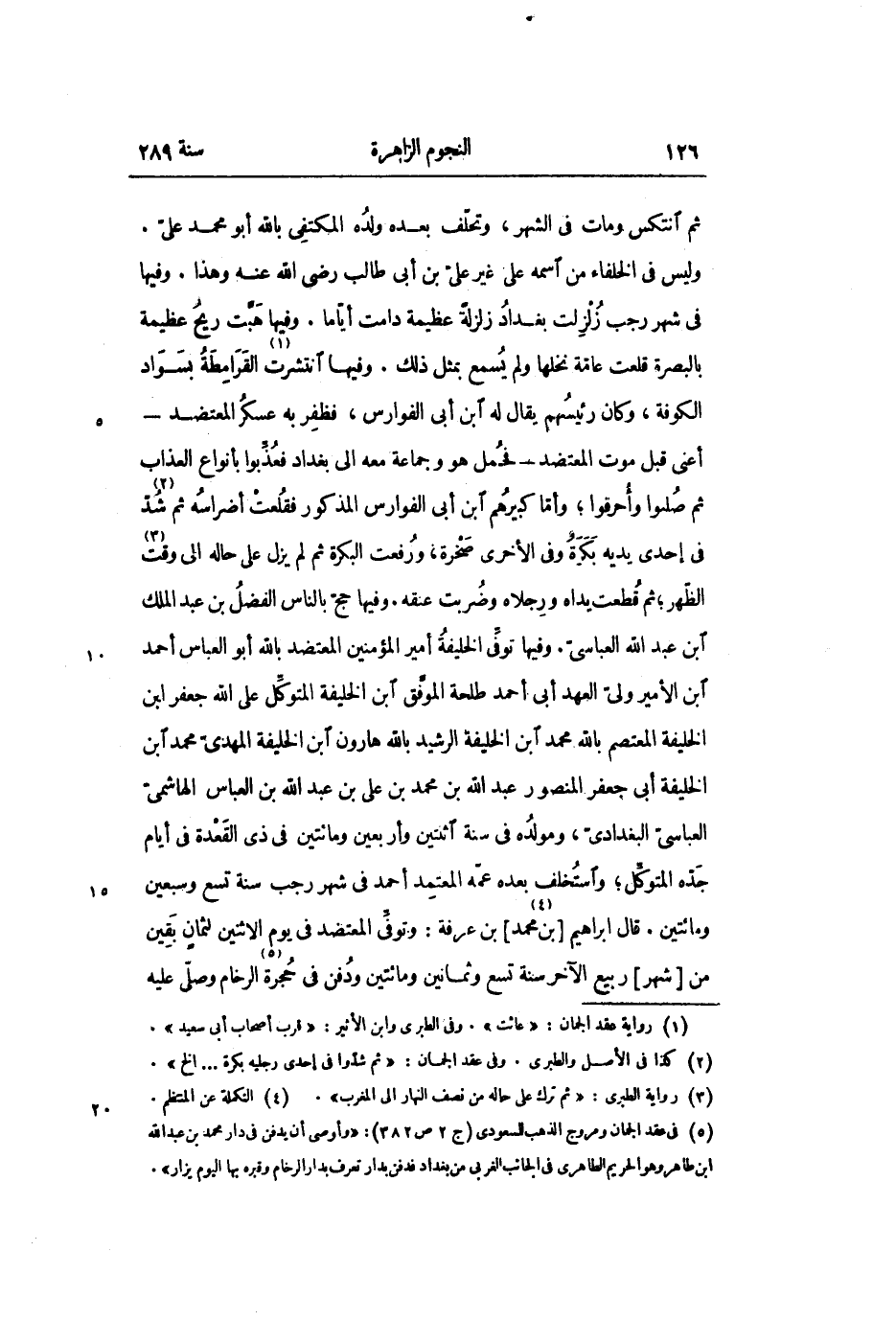 وليس في الخلفاء من اسمه على غير علىّ بن أبى طالب رضى الله عنه وهذا. وفيها فى شهر رجب زلزلت بغداد زلزلة عظيمة دامت أيّاما. وفيها هبّت ريح عظيمة بالبصرة قلعت عامّة نخلها ولم يسمع بمثل ذلك. وفيها انتشرت «1» القرامطة بسواد الكوفة، وكان رئيسهم يقال له ابن أبى الفوارس، فظفر به عسكر المعتضد- أعنى قبل موت المعتضد- فحمل هو وجماعة معه الى بغداد فعذّبوا بأنواع العذاب ثم صلوا وأحرقوا؛ وأمّا كبيرهم ابن أبى الفوارس المذكور فقلعت أضراسه ثم شدّ «2» فى إحدى يديه بكرة وفي الأخرى صخرة، ورفعت البكرة ثم لم يزل على حاله الى وقت «3» الظّهر؛ ثم قطعت يداه ورجلاه وضربت عنقه. وفيها حجّ بالناس الفضل بن عبد الملك ابن عبد الله العباسىّ. وفيها توفّى الخليفة أمير المؤمنين المعتضد بالله أبو العباس أحمد ابن الأمير ولىّ العهد أبى أحمد طلحة الموفّق ابن الخليفة المتوكّل على الله جعفر ابن الخليفة المعتصم بالله محمد ابن الخليفة الرشيد بالله هارون ابن الخليفة المهدىّ محمد ابن الخليفة أبى جعفر المنصور عبد الله بن محمد بن على بن عبد الله بن العباس الهاشمىّ العباسىّ البغدادىّ، ومولده في سنة اثنتين وأربعين ومائتين في ذى القعدة في أيام جدّه المتوكّل؛ واستخلف بعده عمّه المعتمد أحمد في شهر رجب سنة تسع وسبعين ومائتين. قال ابراهيم [بن «4» محمد] بن عرفة: وتوفّى المعتضد في يوم الاثنين لثمان بقين من [شهر] ربيع الآخر سنة تسع وثمانين ومائتين ودفن في حجرة «5» الرخام وصلّى عليه