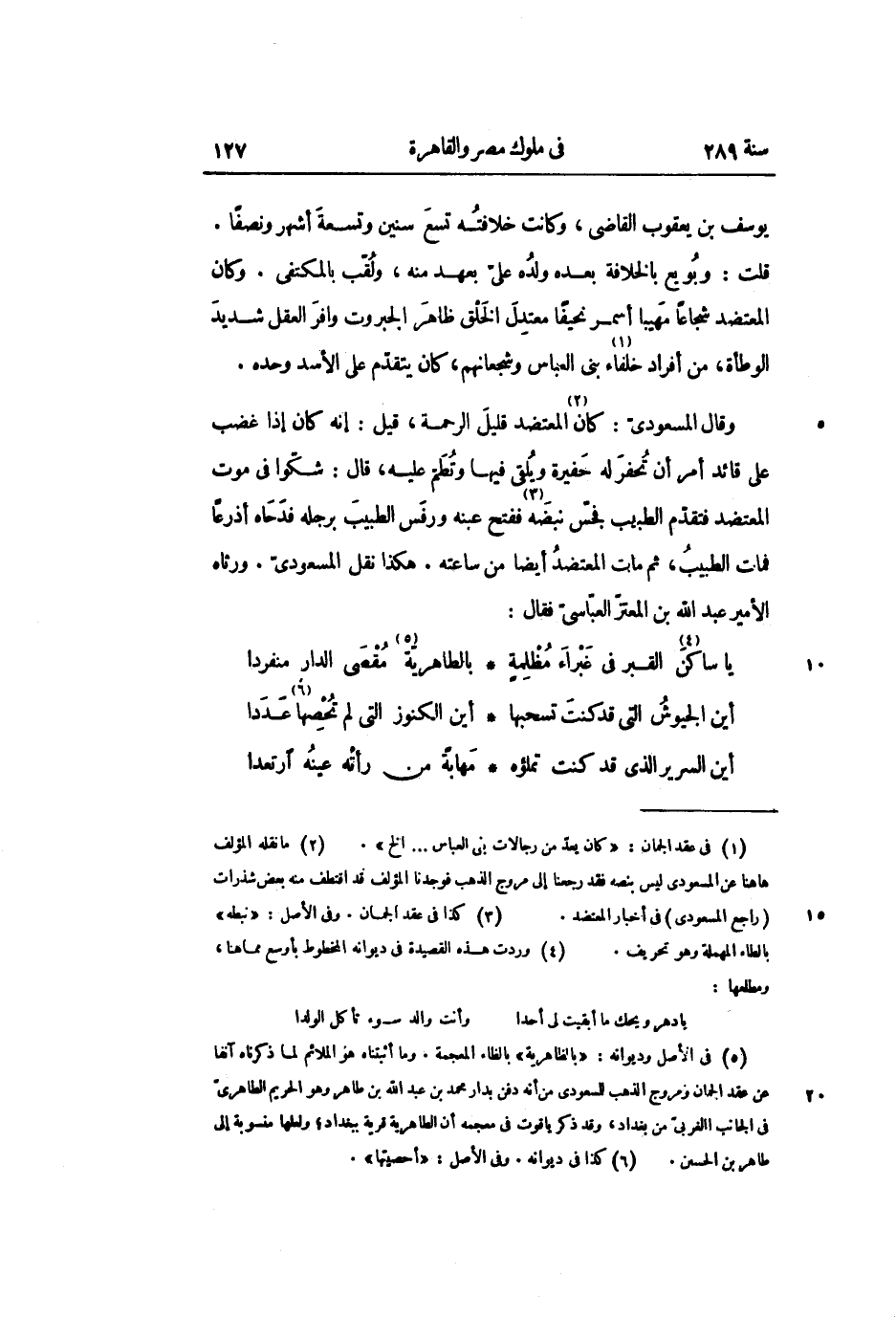 وقال المسعودىّ: كان «2» المعتضد قليل الرحمة، قيل: إنه كان إذا غضب على قائد أمر أن تحفر له حفيرة ويلقى فيها وتطمّ عليه، قال: شكّوا في موت المعتضد فتقدّم الطبيب فجسّ نبضه «3» ففتح عبنه ورفس الطبيب برجله فدحاه أذرعا فمات الطبيب، ثم مات المعتضد أيضا من ساعته. هكذا نقل المسعودىّ. ورثاه الأمير عبد الله بن المعتزّ العبّاسىّ فقال: