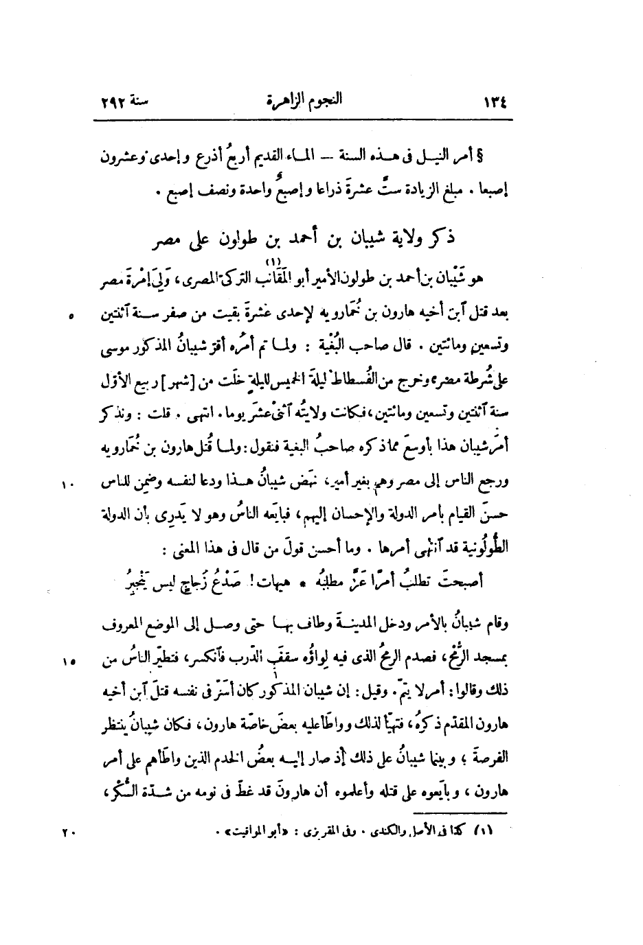 أمر النيل في هذه السنة- الماء القديم أربع أذرع وإحدى وعشرون إصبعا. مبلغ الزيادة ستّ عشرة ذراعا وإصبع واحدة ونصف إصبع.