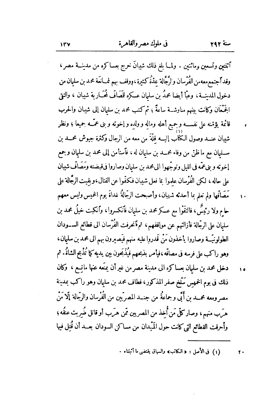 اثنتين وتسعين ومائتين. ولما بلغ ذلك شيبان خرج بعساكره من مدينة مصر، وقد اجتمع معه من الفرسان والرّجّالة عدّة كثيرة، ووقف بهم لممانعة محمد بن سليمان من دخول المدينة، وعبّأ أيضا محمد بن سليمان عسكره للمصافّ لمحاربة شيبان، والتقى الجمعان وكانت بينهم مناوشة ساعة؛ ثم كتب محمد بن سليمان إلى شيبان والحرب قائمة يؤمّنه على نفسه وجميع أهله وماله وولده وإخوته وبنى عمّه جميعا؛ ونظر شيبان عند وصول الكتاب «1» إليه قلّة من معه من الرجال وكثرة جيوش محمد بن سليمان مع ما ظنّ من وفاء محمد بن سليمان له، فاستأمن إلى محمد بن سليمان وجمع إخوته وبنى عمّه في الليل وتوجّهوا الى محمد بن سليمان وصاروا في قبضته ومصافّ شيبان على حاله، لكن الفرسان علموا بما فعل شيبان فكفّوا عن القتال، وبقيت الرجّالة على مصافّها ولم تعلم بما أحدثه شيبان، وأصبحت الرجّالة غداة يوم الخميس وليس معهم حام ولا رئيس، فالتقوا مع عسكر محمد بن سليمان فانكسروا، وانكبت خيل محمد بن سليمان على الرجّالة فأزالتهم عن مواقفهم، ثم انحرفت الفرسان الى قطائع السودان الطولونيّة وصاروا يأخذون من قدروا عليه منهم فيصيرون بهم الى محمد بن سليمان، وهو راكب على فرسه في مصافّه، فيأمر بذبحهم فيذبحون بين يديه كما تذبح الشاة. ثم دخل محمد بن سليمان بعساكره الى مدينة مصر من غير أن يمنعه عنها مانع، وكان ذلك في يوم الخميس سلخ صفر المذكور، فطاف محمد بن سليمان وهو راكب بمدينة مصر ومعه محمد بن أبّى وجماعة من جند المصريّين من الفرسان والرجّالة إلّا من هرب منهم، وصار كلّ من أخذ من المصريين ممّن هرب أو قاتل ضربت عنقه؛ وأحرقت القطائع التى كانت حول الميدان من مساكن السودان بعد أن قتل فيها