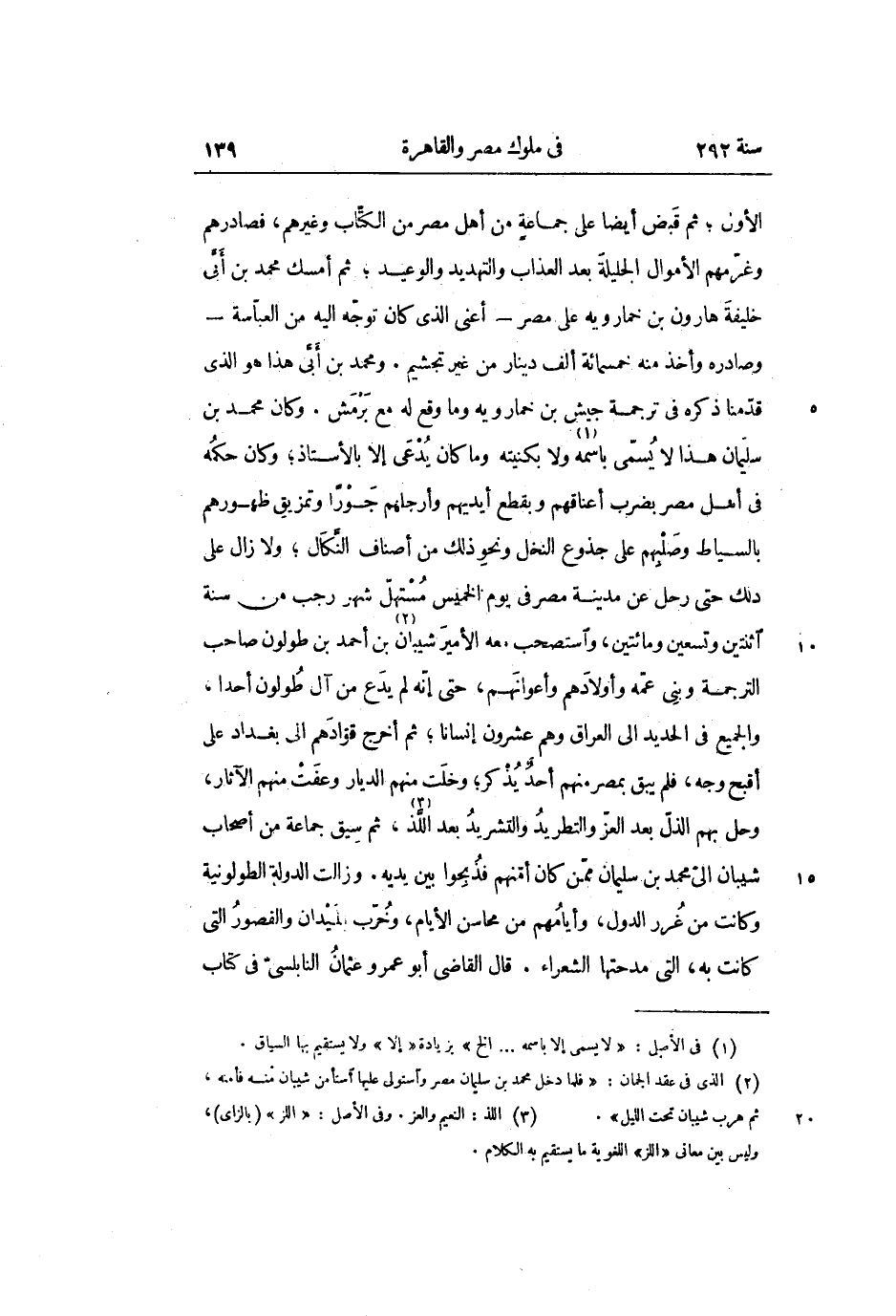 الأول؛ ثم قبض أيضا على جماعة من أهل مصر من الكتّاب وغيرهم، فصادرهم وغرّمهم الأموال الجليلة بعد العذاب والتهديد والوعيد؛ ثم أمسك محمد بن أبّى خليفة هارون بن خمارويه على مصر- أعنى الذي كان توجّه إليه من العبّاسة- وصادره وأخذ منه خمسمائة ألف دينار من غير تجشيم. ومحمد بن أبّى هذا هو الذي قدّمنا ذكره في ترجمة جيش بن خمارويه وما وقع له مع برمش. وكان محمد بن سليمان هذا لا يسمّى باسمه «1» ولا بكنيته وما كان يدعى إلا بالأستاذ؛ وكان حكمه فى أهل مصر بضرب أعناقهم وبقطع أيديهم وأرجلهم جورا وتمزيق ظهورهم بالسياط وصلبهم على جذوع النخل ونحو ذلك من أصناف النّكال؛ ولا زال على ذلك حتى رحل عن مدينة مصر في يوم الخميس مستهلّ شهر رجب من سنة اثنتين وتسعين ومائتين، واستصحب معه الأمير شيبان «2» بن أحمد بن طولون صاحب الترجمة وبنى عمّه وأولادهم وأعوانهم، حتى إنّه لم يدع من آل طولون أحدا، والجميع في الحديد الى العراق وهم عشرون إنسانا؛ ثم أخرج قوّادهم الى بغداد على أقبح وجه، فلم يبق بمصر منهم أحد يذكر؛ وخلت منهم الديار وعفت منهم الآثار، وحل بهم الذلّ بعد العزّ والتطريد والتشريد بعد اللّذ «3» ، ثم سيق جماعة من أصحاب شيبان الىّ محمد بن سليمان ممّن كان أمّنهم فذبحوا بين يديه. وزالت الدولة الطولونية وكانت من غرر الدول، وأيامهم من محاسن الأيام، وخرّب الميدان والقصور التى كانت به، التى مدحتها الشعراء. قال القاضى أبو عمرو عثمان النابلسىّ في كتاب