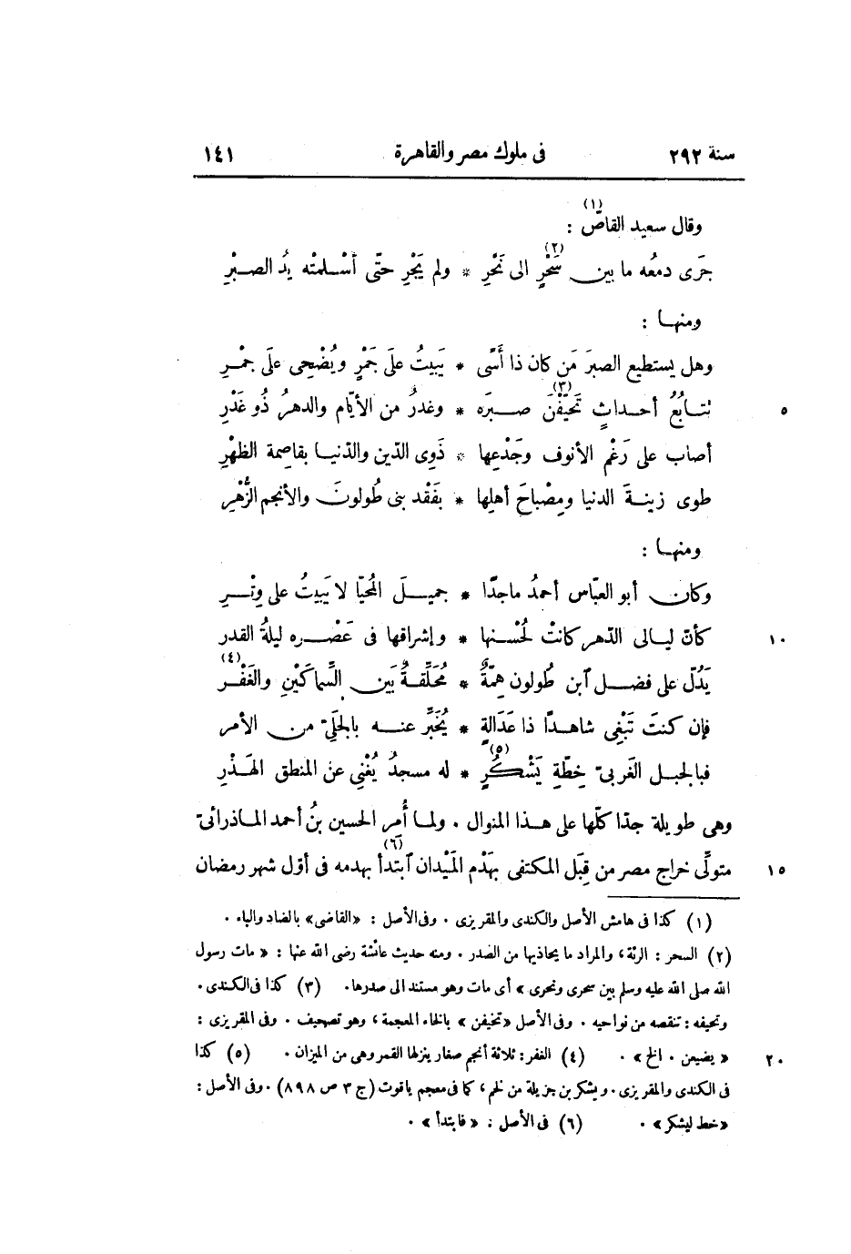 وهى طويلة جدّا كلّها على هذا المنوال. ولما أمر الحسين بن أحمد الماذرائىّ متولّى خراج مصر من قبل المكتفى بهدم الميدان ابتدأ «6» بهدمه في أوّل شهر رمضان