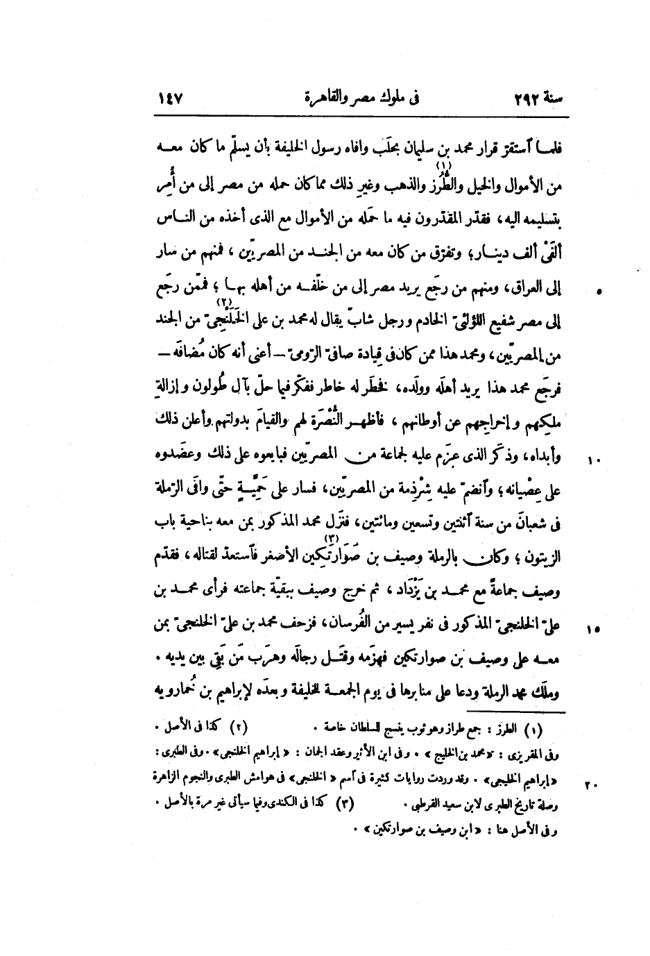 فلما استقرّ قرار محمد بن سليمان بحلب وافاه رسول الخليفة بأن يسلّم ما كان معه من الأموال والخيل والطّرز «1» والذهب وغير ذلك مما كان حمله من مصر إلى من أمر بتسليمه إليه، فقدّر المقدّرون فيه ما حمله من الأموال مع الذي أخذه من الناس ألفى ألف دينار؛ وتفرّق من كان معه من الجند من المصريّين، فمنهم من سار إلى العراق، ومنهم من رجع يريد مصر إلى من خلّفه من أهله بها؛ فممّن رجع إلى مصر شفيع اللؤلؤيّ الخادم ورجل شابّ يقال له محمد بن على الخلنجىّ «2» من الجند من المصريّين، ومحمد هذا ممن كان في قيادة صافىّ الرّومىّ- أعنى أنه كان مضافه- فرجع محمد هذا يريد أهله وولده، فخطر له خاطر ففكّر فيما حلّ بآل طولون وإزالة ملكهم وإخراجهم عن أوطانهم، فأظهر النّصرة لهم والقيام بدولتهم وأعلن ذلك وأبداه، وذكر الذي عزم عليه لجماعة من المصريّين فبايعوه على ذلك وعضدوه على عصيانه؛ وانضمّ عليه شرذمة من المصريّين، فسار على حميّة حتّى وافى الرّملة فى شعبان من سنة اثنتين وتسعين ومائتين، فنزل محمد المذكور بمن معه بناحية باب الزيتون؛ وكان بالرملة وصيف بن صوارتكين «3» الأصغر فاستعدّ لقتاله، فقدّم وصيف جماعة مع محمد بن يزداد، ثم خرج وصيف ببقيّة جماعته فرأى محمد بن علىّ الخلنجىّ المذكور في نفر يسير من الفرسان، فزحف محمد بن علىّ الخلنجىّ بمن معه على وصيف بن صوارتكين فهزمه وقتل رجاله وهرب من بقى بين يديه.