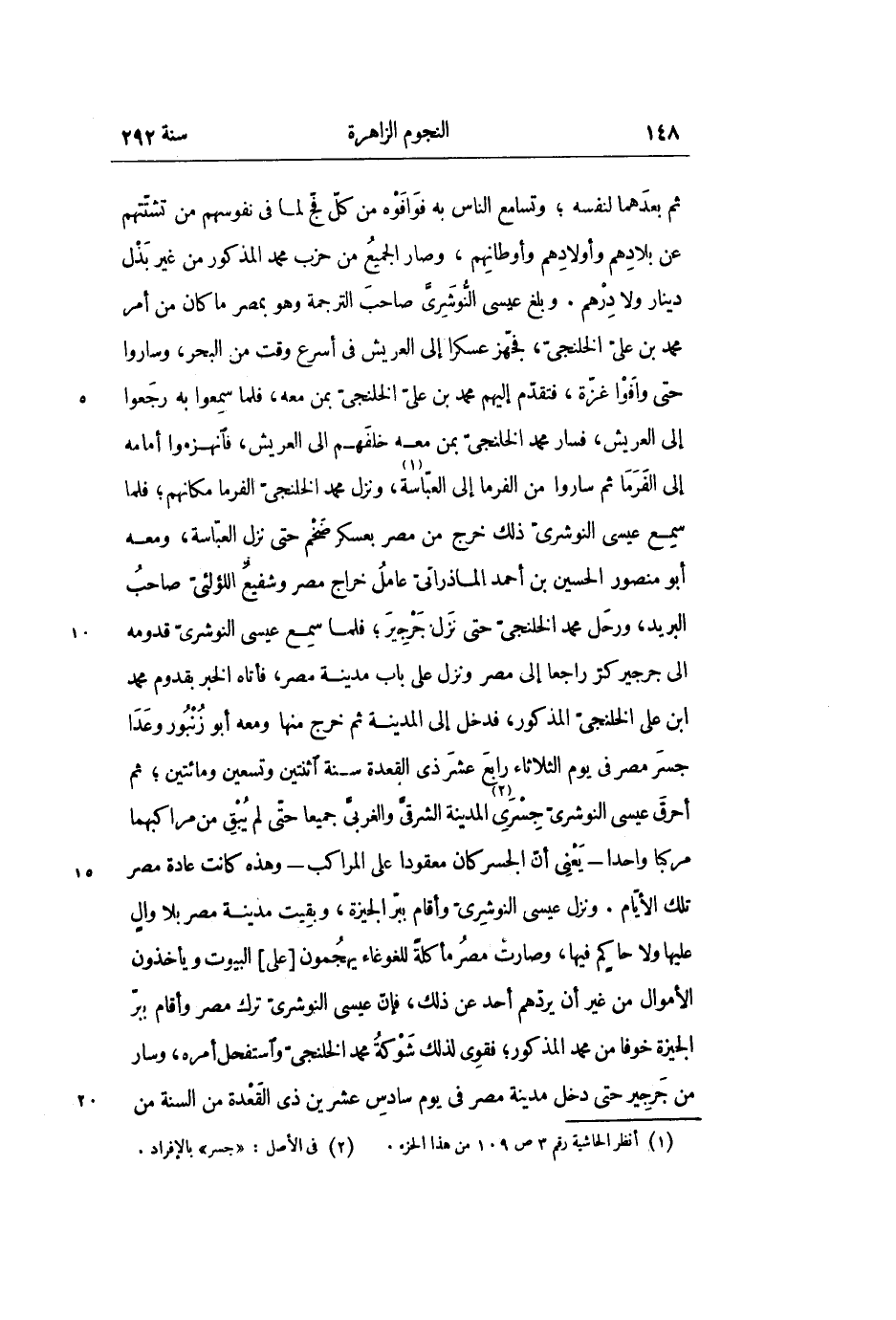 ثم بعدهما لنفسه؛ وتسامع الناس به فوافوه من كلّ فجّ لما في نفوسهم من تشتّتهم عن بلادهم وأولادهم وأوطانهم، وصار الجميع من حزب محمد المذكور من غير بذل دينار ولا درهم. وبلغ عيسى النّوشرىّ صاحب الترجمة وهو بمصر ما كان من أمر محمد بن علىّ الخلنجىّ، فجّهز عسكرا إلى العريش في أسرع وقت من البحر، وساروا حتى وافوا غزّة، فتقدّم إليهم محمد بن علىّ الخلنجىّ بمن معه، فلما سمعوا به رجعوا إلى العريش، فسار محمد الخلنجىّ بمن معه خلفهم الى العريش، فانهزموا أمامه إلى الفرما ثم ساروا من الفرما إلى العبّاسة «1» ، ونزل محمد الخلنجىّ الفرما مكانهم؛ فلما سمع عيسى النوشرىّ ذلك خرج من مصر بعسكر ضخم حتى نزل العبّاسة، ومعه أبو منصور الحسين بن أحمد الماذرائىّ عامل خراج مصر وشفيع اللؤلؤيّ صاحب البريد، ورحل محمد الخلنجىّ حتى نزل جرجير؛ فلما سمع عيسى النوشرىّ قدومه الى جرجير كرّ راجعا إلى مصر ونزل على باب مدينة مصر، فأتاه الخبر بقدوم محمد ابن على الخلنجىّ المذكور، فدخل إلى المدينة ثم خرج منها ومعه أبو زنبور وعدا جسر مصر في يوم الثلاثاء رابع عشر ذى القعدة سنة اثنتين وتسعين ومائتين؛ ثم أحرق عيسى النوشرىّ جسرى «2» المدينة الشرقىّ والغربىّ جميعا حتّى لم يبق من مراكبهما مركبا واحدا- يعنى أنّ الجسر كان معقودا على المراكب- وهذه كانت عادة مصر تلك الأيّام. ونزل عيسى النوشرىّ وأقام ببرّ الجيزة، وبقيت مدينة مصر بلا وال عليها ولا حاكم فيها، وصارت مصر مأكلة للغوغاء يهجمون [على] البيوت ويأخذون الأموال من غير أن يردّهم أحد عن ذلك، فإنّ عيسى النوشرىّ ترك مصر وأقام ببرّ الجيزة خوفا من محمد المذكور؛ فقوى لذلك شوكة محمد الخلنجىّ واستفحل أمره، وسار من جرجير حتى دخل مدينة مصر في يوم سادس عشرين ذى القعدة من السنة من