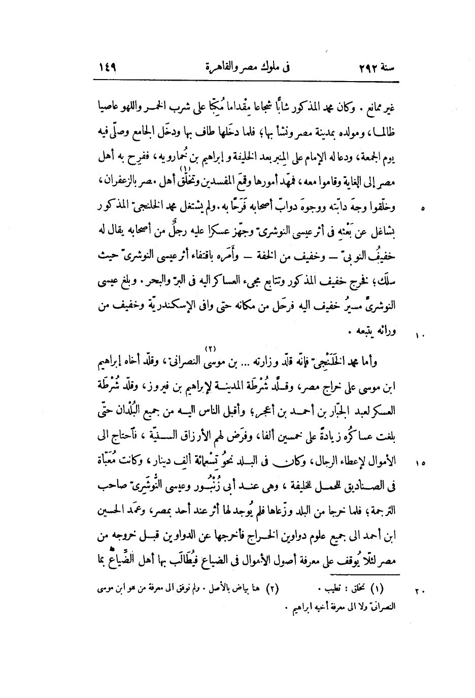 وأما محمد الخلنجىّ فإنّه قلّد وزارته ... بن موسى «2» النصرانىّ، وقلّد أخاه إبراهيم ابن موسى على خراج مصر، وقلّد شرطة المدينة لإبراهيم بن فيروز، وقلّد شرطة العسكر لعبد الجبّار بن أحمد بن أعجر؛ وأقبل الناس إليه من جميع البلدان حتّى بلغت عساكره زيادة على خمسين ألفا، وفرض لهم الأرزاق السنيّة، فاحتاج الى الأموال لإعطاء الرجال، وكان في البلد نحو تسعمائة ألف دينار، وكانت معبّأة فى الصناديق للحمل للخليفة، وهى عند أبى زنبور وعيسى النّوشرىّ صاحب الترجمة؛ فلما خرجا من البلد وزّعاها فلم يوجد لها أثر عند أحد بمصر، وعمد الحسين ابن أحمد الى جميع علوم دواوين الخراج فأخرجها عن الدواوين قبل خروجه من مصر لئلّا يوقف على معرفة أصول الأموال في الضياع فيطالب بها أهل الضّياع بما