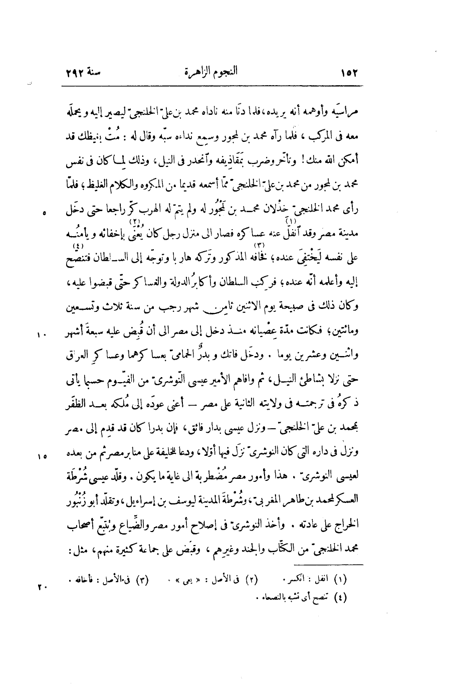 مراسيه وأوهمه أنه يريده، فلما دنا منه ناداه محمد بن علىّ الخلنجىّ ليصير إليه ويحمله معه في المركب، فلما رآه محمد بن لمجور وسمع نداءه سبّه وقال له: مت بغيظك قد أمكن الله منك! وتأخّر وضرب بمقاذيفه وانحدر في النيل، وذلك لما كان في نفس محمد بن لمجور من محمد بن علىّ الخلنجىّ ممّا أسمعه قديما من المكروه والكلام الغليظ؛ فلمّا رأى محمد الخلنجىّ خذلان محمد بن لمجور له ولم يتمّ له الهرب كرّ راجعا حتى دخل مدينة مصر وقد انفلّ «1» عنه عساكره فصار الى منزل رجل كان يعنى «2» بإخفائه ويأمنه على نفسه ليختفى عنده؛ فخافه «3» المذكور وتركه هاربا وتوجّه إلى السلطان فتنصّح «4» إليه وأعلمه أنّه عنده؛ فركب السلطان وأكابر الدولة والعساكر حتّى قبضوا عليه، وكان ذلك في صبيحة يوم الاثنين ثامن شهر رجب من سنة ثلاث وتسعين ومائتين؛ فكانت مدّة عصيانه منذ دخل إلى مصر الى أن قبض عليه سبعة أشهر واثنين وعشرين يوما. ودخل فاتك وبدر الحمامىّ بعساكرهما وعساكر العراق حتى نزلا بشاطئ النيل، ثم وافاهم الأمير عيسى النّوشرىّ من الفيّوم حسبما يأتى ذكره في ترجمته في ولايته الثانية على مصر- أعنى عوده إلى ملكه بعد الظفر بمحمد بن علىّ الخلنجىّ- ونزل عيسى بدار فائق، فإن بدرا كان قد قدم إلى مصر ونزل في داره التى كان النوشرىّ نزل فيها أوّلا، ودعا للخليفة على منابر مصر ثم من بعده لعيسى النوشرىّ. هذا وأمور مصر مضطربة الى غاية ما يكون. وقلّد عيسى شرطة العسكر لمحمد بن طاهر المغربىّ، وشرطة المدينة ليوسف بن إسرائيل، وتقلّد أبو زنبور الخراج على عادته. وأخذ النوشرىّ في إصلاح أمور مصر والضّياع وتتبّع أصحاب محمد الخلنجىّ من الكتّاب والجند وغيرهم، وقبض على جماعة كثيرة منهم، مثل: