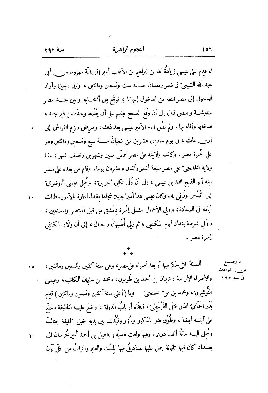 السنة التى حكم فيها أربعة أمراء على مصر، وهى سنة اثنتين وتسعين ومائتين، والأمراء الأربعة: شيبان بن أحمد بن طولون، ومحمد بن سليمان الكاتب، وعيسى النّوشرىّ، ومحمد بن علىّ الخلنجىّ- فيها (أعنى سنة اثنتين وتسعين ومائتين) قدم بدر الحمّامىّ الذي قتل القرمطىّ، فنلقّاه أرباب الدولة، وخلع عليه الخليفة وخلع على ابنه أيضا، وطوّق بدر المذكور وسوّر وقيّدت بين يديه خيل الخليفة جنائب وحمل إليه مائة ألف درهم. وفيها وافت هديّة إسماعيل بن أحمد أمير خراسان الى بغداد كان فيها ثلثمائة جمل عليها صناديق فيها المسك والعنبر والثياب من كلّ لون