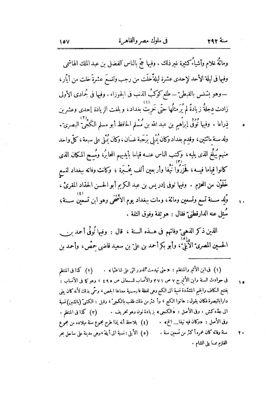 ومائة غلام وأشياء كثيرة غير ذلك. وفيها حجّ بالناس الفضل بن عبد الملك الهاشمى وفيها في ليلة الأحد لإحدى عشرة ليلة خلت من رجب ولتسع عشرة خلت من أيّار،- وهو بشنس بالقبطىّ- طلع كوكب الذنب في الجوزاء. وفيها في جمادى الأولى زادت دجلة زيادة لم ير مثلها حتّى خربت «1» بغداد، وبلغت الزيادة إحدى وعشرين ذراعا. وفيها توفّى إبراهيم بن عبد الله بن مسلم الحافظ أبو مسلم الكجّىّ»