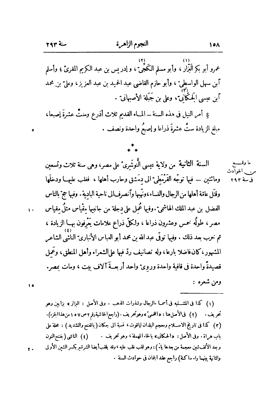 السنة الثانية من ولاية عيسى النّوشرىّ على مصر، وهى سنة ثلاث وتسعين ومائتين- فيها توجّه القرمطىّ الى دمشق وحارب أهلها، فغلب عليها ودخلها وقتل عامّة أهلها من الرجال والنساء، ونهبها وانصرف الى ناحية البادية. وفيها حجّ بالناس الفضل بن عبد الملك الهاشمىّ. وفيها عمل على دجلة من جانبيها مقياس مثل مقياس مصر، طوله خمس وعشرون ذراعا، ولكلّ ذراع علامات يعرفون بها الزيادة، ثم خرب بعد ذلك. وفيها توفّى عبد الله بن محمد أبو العباس الأنبارىّ الناشى «4» الشاعر المشهور، كان فاضلا بارعا، وله تصانيف ردّ فيها على الشعراء وأهل المنطق، وعمل قصيدة واحدة في قافية واحدة وروىّ واحد أربعة آلاف بيت، ومات بمصر.