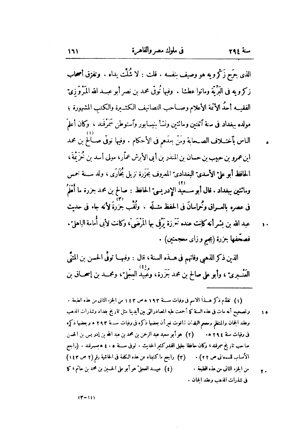 الذي جرح زكرويه هو وصيف بنفسه. قلت: لا شلّت يداه. وتفرّق أصحاب زكرويه في البرّيّة وماتوا عطشا. وفيها توفّى محمد بن نصر أبو عبد الله المروزىّ الفقيه أحد الأئمة الأعلام وصاحب التصانيف الكثيرة والكتب المشهورة؛ مولده ببغداد في سنة اثنتين ومائتين ونشأ بنيسابور واستوطن سمرقند، وكان أعلم الناس باختلاف الصحابة ومن بعدهم في الأحكام. وفيها توفّى صالح «1» بن محمد ابن عمرو بن حبيب بن حسان بن المنذر بن أبى الأبرش عمّار، مولى أسد بن خزيمة، الحافظ أبو علىّ الأسدىّ البغدادىّ المعروف بجزرة نزيل بخارى، ولد سنة خمس ومائتين ببغداد. قال أبو سعيد «2» الإدريسىّ الحافظ: صالح بن محمد جزرة ما أعلم فى عصره بالعراق وخراسان في الحفظ مثله. ولقّب جزرة «3» لأنه جاء في حديث عبد الله بن بشر أنه كانت عنده خرزة يرقى بها المرضى، وكانت لأبى أمامة الباهلىّ، فصحّفها جزرة (بجيم وزاى معجمتين) .