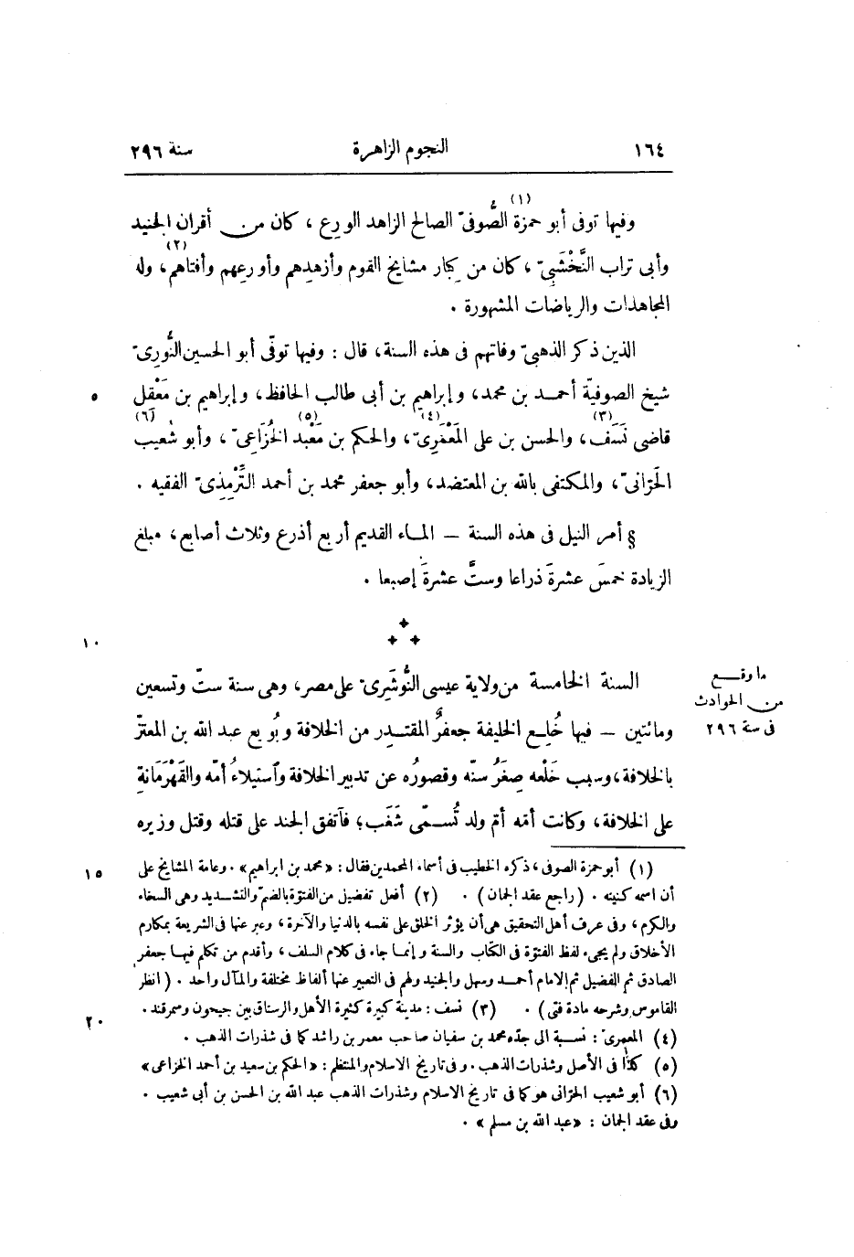 السنة الخامسة من ولاية عيسى النّوشرىّ على مصر، وهى سنة ستّ وتسعين ومائتين- فيها خلع الخليفة جعفر المقتدر من الخلافة وبويع عبد الله بن المعتزّ بالخلافة، وسبب خلعه صغر سنّه وقصوره عن تدبير الخلافة واستيلاء أمّه والقهرمانة على الخلافة، وكانت أمّه أمّ ولد تسمّى شغب؛ فآتفق الجند على قتله وقتل وزيره