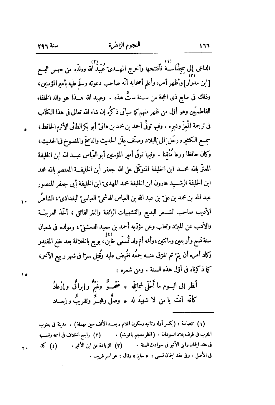 الداعى إلى سجلماسة «1» فافتتحها وأخرج المهدىّ عبيد الله «2» وولده من حبس اليسع [ابن مدرار «3» ] وأظهر أمره وأعلم أصحابه أنّه صاحب دعوته وسلّم عليه بأمير المؤمنين، وذلك في سابع ذى الحجة من سنة ستّ هذه. وعبيد الله هذا هو والد الخلفاء الفاطميّين وهو أوّل من ظهر منهم كما سيأتى ذكره إن شاء الله تعالى في هذا الكتاب فى ترجمة المعزّ وغيره. وفيها توفّى أحمد بن محمد بن هانئ أبو بكر الطائى الأثرم الحافظ، سمع الكثير ورحل [الى] البلاد وصنّف علل الحديث والناسخ والمنسوخ في الحديث، وكان حافظا ورعا متقنا. وفيها توفّى أمير المؤمنين أبو العبّاس عبد الله ابن الخليفة المعتزّ بالله محمد ابن الخليفة المتوكّل على الله جعفر ابن الخليفة المعتصم بالله محمد ابن الخليفة الرشيد هارون ابن الخليفة محمد المهدىّ ابن الخليفة أبى جعفر المنصور عبد الله بن محمد بن علىّ بن عبد الله بن العباس الهاشمىّ العباسىّ البغدادىّ، الشاعر الأديب صاحب الشعر البديع والتشبيهات الرائقة والنثر الفائق، أخذ العربيّة والأدب عن المبرّد وثعلب وعن مؤدّبه أحمد بن سعيد الدمشقىّ، ومولده في شعبان سنة تسع وأربعين ومائتين، وأمّه أمّ ولد تسمّى خاين «4» ، بويع بالخلافة بعد خلع المقتدر وكاد أمره أن يتمّ ثم تفرّق عنه جمعه فقبض عليه وقتل سرّا في شهر ربيع الآخر، كما ذكرناه في أوّل هذه السنة. ومن شعره: