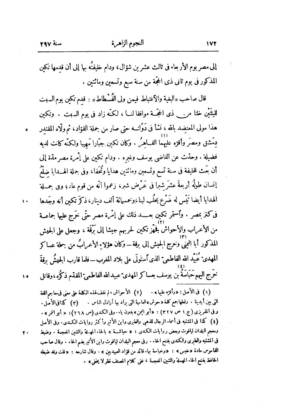 قال صاحب «البغية والاغتباط فيمن ولى الفسطاط» : قدم تكين يوم السبت لليلتين خلتا من ذى الحجّة موافقا لنا، لكنّه زاد في يوم السبت. وتكين هذا مولى المعتضد بالله، نشأ في دولته حتى صار من جملة القوّاد، ثم ولّاه المقتدر دمشق ومصر وأقرّه عليهما «1» القاهر. وكان تكين جبّارا مهيبا ولكنّه كانت لديه فضيلة. وحدّث عن القاضى يوسف وغيره. ودام تكين على إمرة مصر مدّة إلى أن بعث للخليفة في سنة تسع وتسعين ومائتين هدايا وتحفا، وفي جملة الهدايا ضلع إنسان طوله أربعة عشر شبرا في عرض شبر، زعموا أنّه من قوم عاد؛ وفي جملة الهدايا أيضا تيس له ضرع يحلب لبنا، وخمسمائة ألف دينار، ذكر تكين أنه وجدها فى كنز بمصر. واستمر تكين بعد ذلك على إمرة مصر حتّى خرج عليها جماعة من الأعراب والأحواش «2» فجهّز تكين لحربهم جيشا إلى برقة، وجعل على الجيش المذكور أبا اليمنى «3» وخرج الجيش إلى برقة- وكان هؤلاء الأعراب من جملة عساكر المهدىّ عبيد الله الفاطمىّ الذي استولى على بلاد المغرب- فلما قارب الجيش برقة خرج إليهم حباسة «4» بن يوسف بعساكر المهدىّ عبيد الله الفاطمىّ المقدّم ذكره، وقاتل