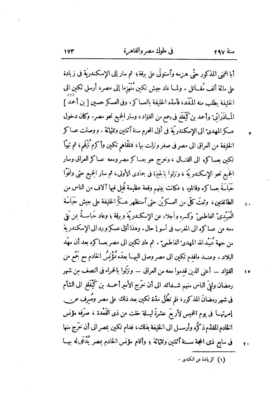 أبا اليمنى المذكور حتّى هزمه واستولى على برقة؛ ثم سار إلى الإسكندرية في زيادة على مائة ألف مقاتل. ولما عاد جيش تكين منهزما إلى مصر، أرسل تكين الى الخليفة يطلب منه المدد، فأمدّه الخليفة بالعساكر، وفي العسكر حسين [بن أحمد «1» ] الماذرائىّ وأحمد بن كيغلغ في جمع من القوّاد، وسار الجميع نحو مصر. وكان دخول عسكر المهدىّ الى الإسكندريّة في أوّل المحرم سنة اثنتين وثلثمائة. ووصلت عساكر الخليفة من العراق الى مصر في صفر ونزلت بها، فتلقّاهم تكين وأكرم نزلهم؛ ثم تهيّأ تكين بعساكره الى القتال، وخرج هو بعساكر مصر ومعه عساكر العراق وسار الجميع نحو الإسكندريّة، ونزلوا بالجيزة في جمادى الأولى، ثم سار الجميع حتى وافوا حباسة بعساكره وقاتلوه؛ فكانت بينهم وقعة عظيمة قتل فيها آلاف من الناس من الطائفتين، وثبت كلّ من العسكرين حتى استظهر عسكر الخليفة على جيش حباسة العبيدىّ الفاطمىّ وكسره وأجلاه عن الإسكندريّة وبرقة؛ وعاد حباسة بمن بقى معه من عساكره الى المغرب في أسوإ حال. وهذا أوّل عسكر ورد الى الإسكندرية من جهة عبيد الله المهدىّ الفاطمىّ. ثم عاد تكين الى مصر بعساكره بعد أن مهّد البلاد. وعند ما قدم تكين الى مصر وصل اليها بعده مؤنس الخادم مع جمع من القوّاد- أعنى الذين قدموا معه من العراق- ونزلوا بالحمراء في النصف من شهر رمضان ولقى الناس منهم شدائد الى أن خرج الأمير أحمد بن كيغلغ الى الشأم فى شهر رمضان المذكور، فلم تطل مدّة تكين بعد ذلك على مصر وصرف عن إمرتها في يوم الخميس لأربع عشرة ليلة خلت من ذى القعدة، صرفه مؤنس الخادم المقدّم ذكره وأرسل الى الخليفة بذلك، فدام تكين بمصر الى أن خرج منها فى سابع ذى الحجة سنة اثنتين وثلثمائة؛ وأقام مؤنس الخادم بمصر يدعى له بها