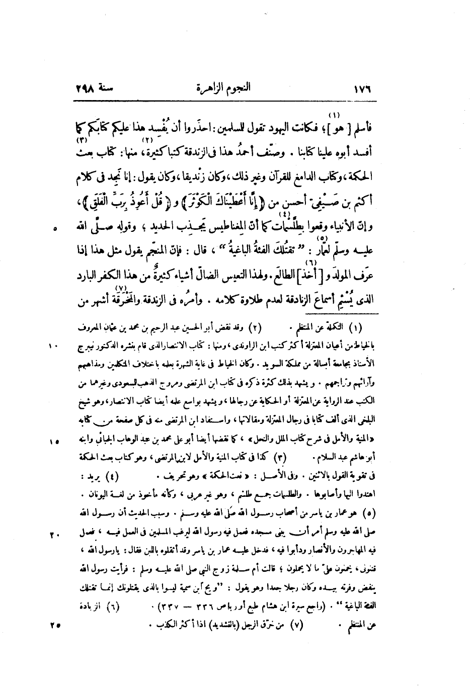 ، وإنّ الأنبياء وقعوا بطلّسمات «4» كما أنّ المغناطيس يجذب الحديد؛ وقوله صلّى الله عليه وسلّم لعمّار «5» :" تقتلك الفئة الباغية"، قال: فإنّ المنجّم يقول مثل هذا إذا عرف المولد و [أخذ «6» ] الطالع. ولهذا التعيس الضالّ أشياء كثيرة من هذا الكفر البارد الذي يسئم أسماع الزنادقة لعدم طلاوة كلامه. وأمره في الزندقة والمخرقة «7» أشهر من