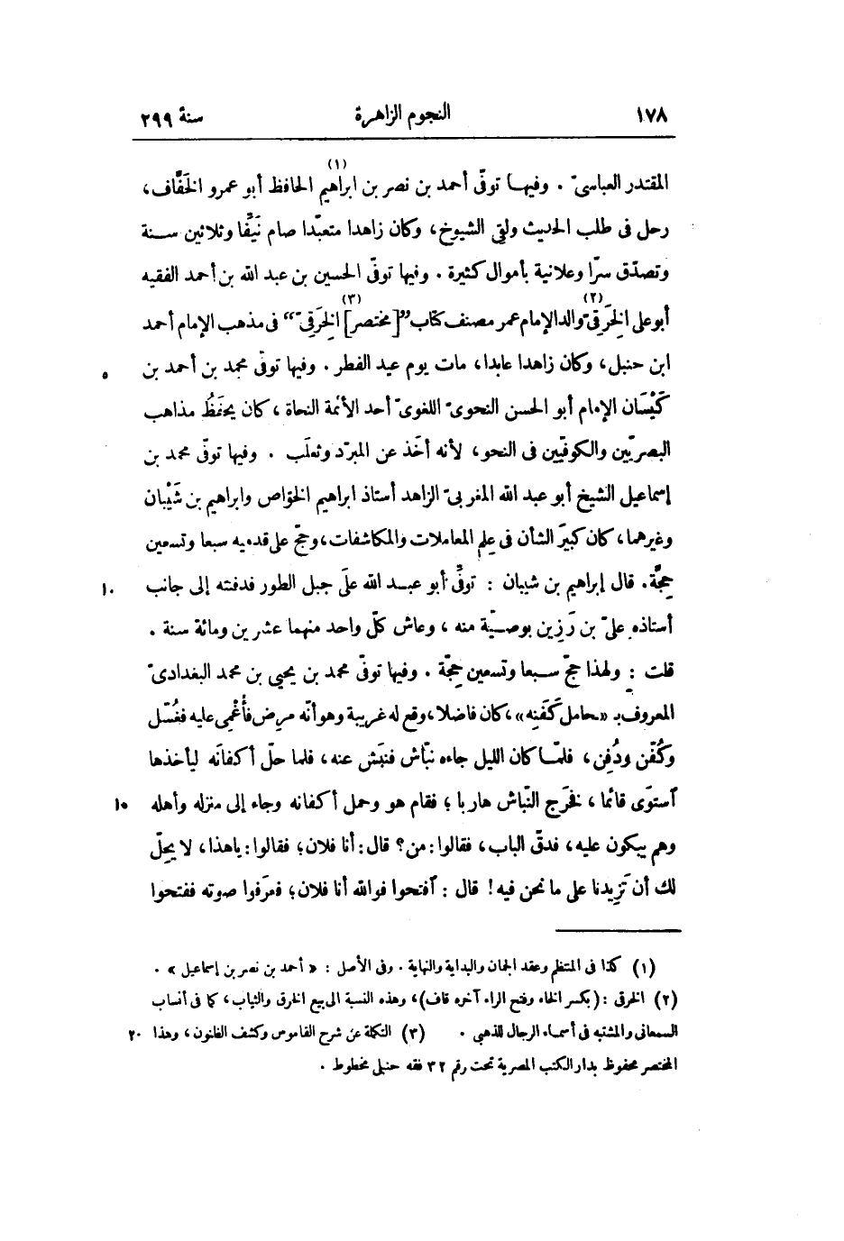 المقتدر العباسىّ. وفيها توفّى أحمد بن نصر بن إبراهيم «1» الحافظ أبو عمرو الخفّاف، رحل في طلب الحديث ولقى الشيوخ، وكان زاهدا متعبّدا صام نيّفا وثلاثين سنة وتصدّق سرّا وعلانية بأموال كثيرة. وفيها توفّى الحسين بن عبد الله بن أحمد الفقيه أبو على الخرقىّ «2» والد الإمام عمر مصنف كتاب" [مختصر «3» ] الخرقىّ" فى مذهب الإمام أحمد ابن حنبل، وكان زاهدا عابدا، مات يوم عيد الفطر. وفيها توفّى محمد بن أحمد بن كيسان الإمام أبو الحسن النحوىّ اللغوىّ أحد الأئمة النحاة، كان يحفظ مذاهب البصريّين والكوفيّين في النحو، لأنه أخذ عن المبرّد وثعلب. وفيها توفّى محمد بن إسماعيل الشيخ أبو عبد الله المغربىّ الزاهد أستاذ ابراهيم الخوّاص وابراهيم بن شيبان وغيرهما، كان كبير الشأن في علم المعاملات والمكاشفات، وحجّ على قدميه سبعا وتسعين حجّة. قال إبراهيم بن شيبان: توفّى أبو عبد الله على جبل الطور فدفنته إلى جانب أستاذه علىّ بن رزين بوصيّة منه، وعاش كلّ واحد منهما عشرين ومائة سنة.