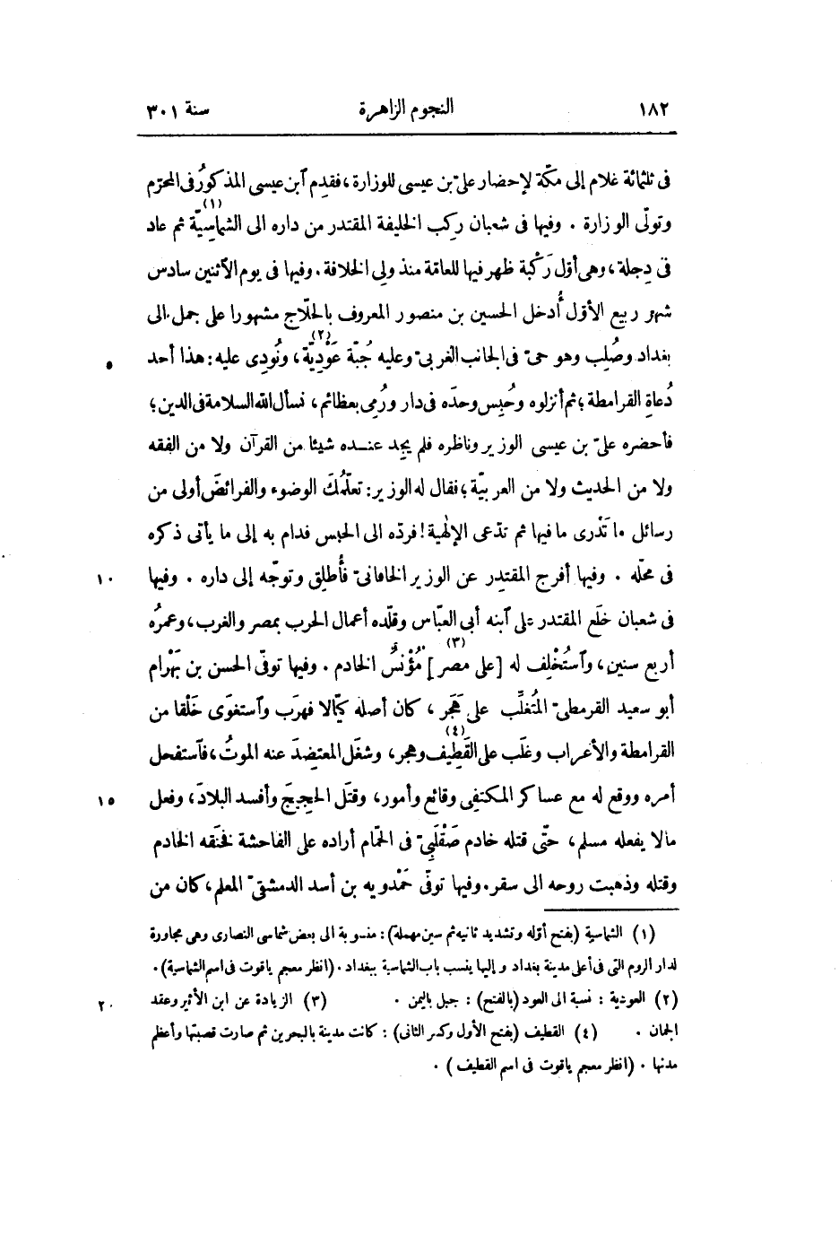 فى ثلثمائة غلام إلى مكّة لإحضار علىّ بن عيسى للوزارة، فقدم ابن عيسى المذكور في المحرّم وتولّى الوزارة. وفيها في شعبان ركب الخليفة المقتدر من داره الى الشماسيّة «1» ثم عاد فى دجلة، وهى أوّل ركبة ظهر فيها للعامّة منذ ولى الخلافة. وفيها في يوم الاثنين سادس شهر ربيع الأوّل أدخل الحسين بن منصور المعروف بالحلّاج مشهورا على جمل إلى بغداد وصلب وهو حىّ في الجانب الغربىّ وعليه جبّة عوديّة «2» ، ونودى عليه: هذا أحد دعاة القرامطة؛ ثم أنزلوه وحبس وحده في دار ورمى بعظائم، نسأل الله السلامة في الدين؛ فأحضره علىّ بن عيسى الوزير وناظره فلم يجد عنده شيئا من القرآن ولا من الفقه ولا من الحديث ولا من العربيّة؛ فقال له الوزير: تعلّمك الوضوء والفرائض أولى من رسائل ما تدرى ما فيها ثم تدّعى الإلهية! فردّه الى الحبس فدام به إلى ما يأتى ذكره فى محلّه. وفيها أفرج المقتدر عن الوزير الخاقانىّ فأطلق وتوجّه إلى داره. وفيها فى شعبان خلع المقتدر على ابنه أبى العبّاس وقلّده أعمال الحرب بمصر والغرب، وعمره أربع سنين، واستخلف له [على مصر «3» ] مؤنس الخادم. وفيها توفّى الحسن بن بهرام أبو سعيد القرمطىّ المتغلّب على هجر، كان أصله كيّالا فهرب واستغوى خلقا من القرامطة والأعراب وغلب على القطيف «4» وهجر، وشغل المعتضد عنه الموت، فاستفحل أمره ووقع له مع عساكر المكتفى وقائع وأمور، وقتل الحجيج وأفسد البلاد، وفعل مالا يفعله مسلم، حتّى قتله خادم صقلبىّ في الحمّام أراده على الفاحشة فخنقه الخادم وقتله وذهبت روحه الى سقر. وفيها توفّى حمدويه بن أسد الدمشقىّ المعلم، كان من
