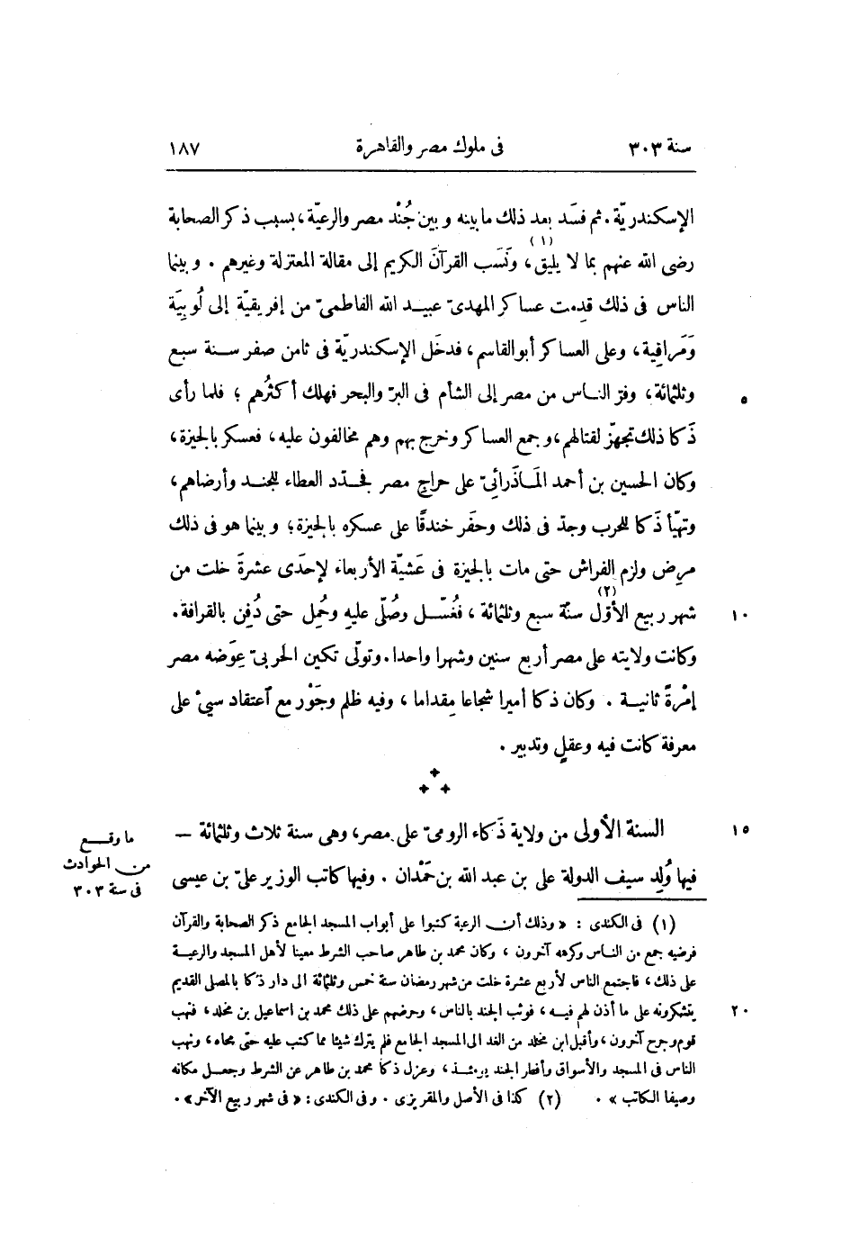 السنة الأولى من ولاية ذكاء الرومىّ على مصر، وهى سنة ثلاث وثلثمائة- فيها ولد سيف الدولة على بن عبد الله بن حمدان. وفيها كاتب الوزير علىّ بن عيسى