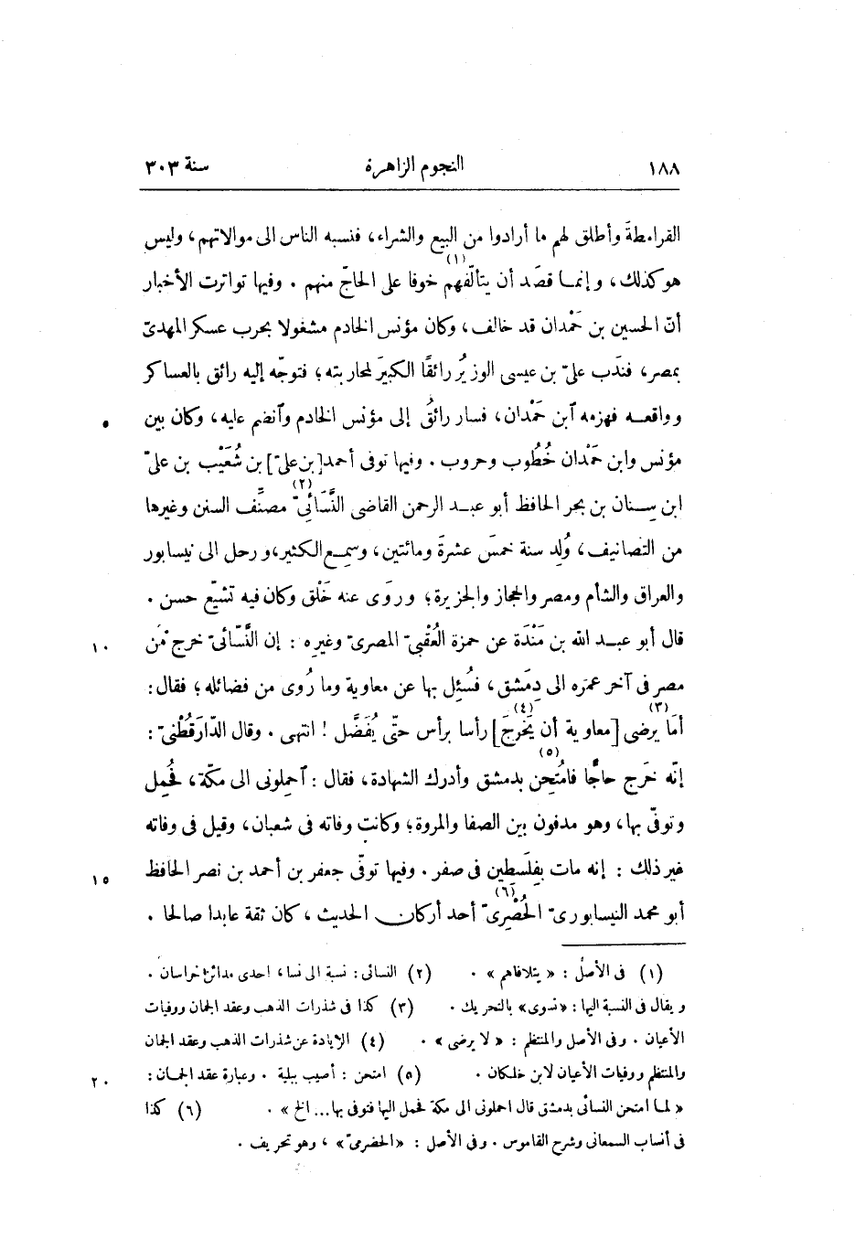 القرامطة وأطلق لهم ما أرادوا من البيع والشراء، فنسبه الناس الى موالاتهم، وليس هو كذلك، وإنما قصد أن يتألّفهم «1» خوفا على الحاجّ منهم. وفيها تواترت الأخبار أنّ الحسين بن حمدان قد خالف، وكان مؤنس الخادم مشغولا بحرب عسكر المهدىّ بمصر، فندب علىّ بن عيسى الوزير رائقا الكبير لمحاربته؛ فتوجّه إليه رائق بالعساكر وواقعه فهزمه ابن حمدان، فسار رائق إلى مؤنس الخادم وانضم عليه، وكان بين مؤنس وابن حمدان خطوب وحروب. وفيها توفى أحمد [بن علىّ] بن شعيب بن علىّ ابن سنان بن بحر الحافظ أبو عبد الرّحمن القاضى النّسائىّ «2» مصنّف السنن وغيرها من التصانيف، ولد سنة خمس عشرة ومائتين، وسمع الكثير، ورحل الى نيسابور والعراق والشأم ومصر والحجاز والجزيرة؛ وروى عنه خلق وكان فيه تشيّع حسن.