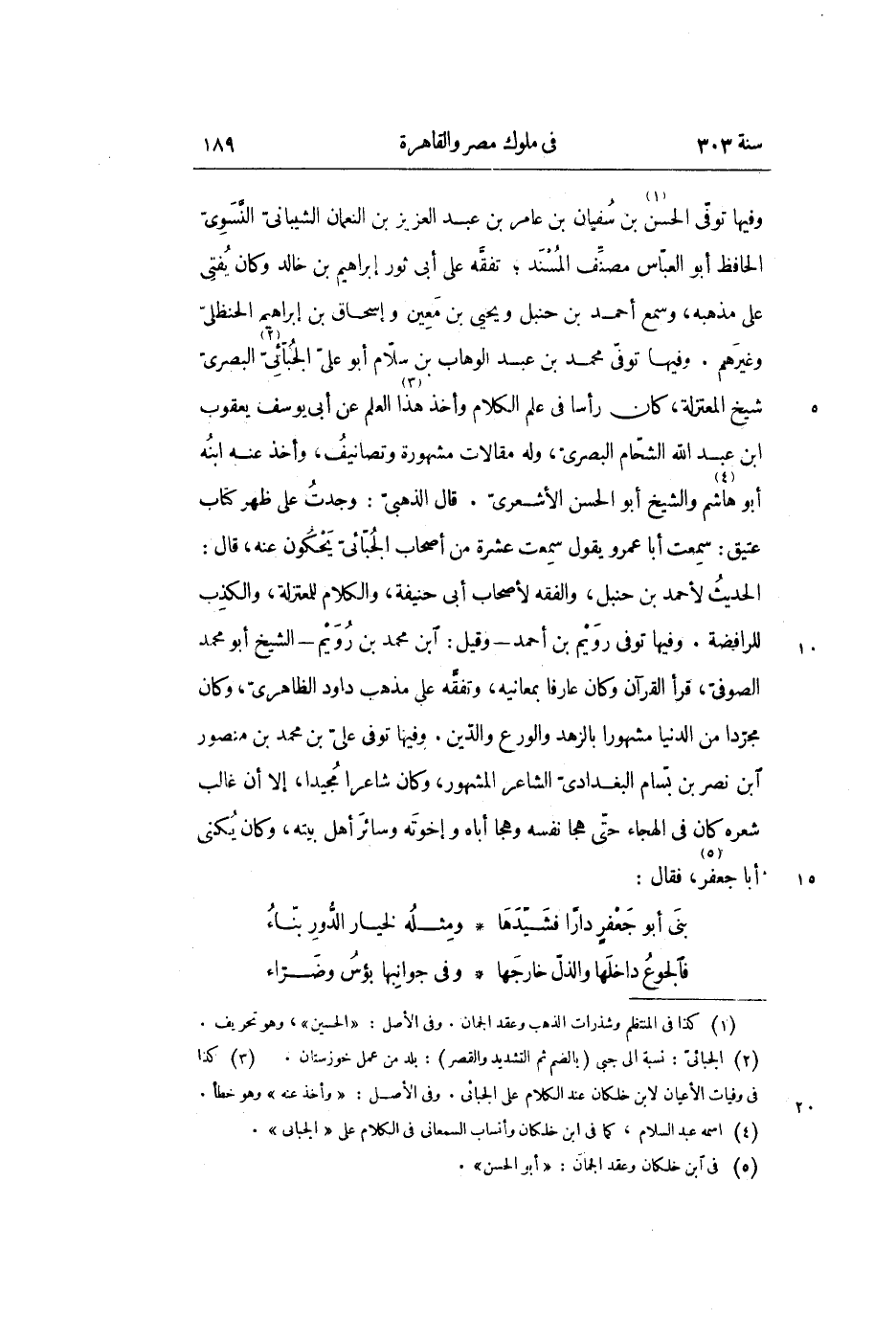 وفيها توفّى الحسن «1» بن سفيان بن عامر بن عبد العزيز بن النعمان الشيبانىّ النّسوىّ الحافظ أبو العبّاس مصنّف المسند؛ تفقّه على أبى ثور إبراهيم بن خالد وكان يفتى على مذهبه، وسمع أحمد بن حنبل ويحيى بن معين وإسحاق بن إبراهيم الحنظلىّ وغيرهم. وفيها توفّى محمد بن عبد الوهاب بن سلّام أبو علىّ الجبّائىّ «2» البصرىّ شيخ المعتزلة، كان رأسا في علم الكلام وأخذ هذا «3» العلم عن أبى يوسف يعقوب ابن عبد الله الشحّام البصرىّ، وله مقالات مشهورة وتصانيف، وأخذ عنه ابنه أبو هاشم «4» والشيخ أبو الحسن الأشعرىّ. قال الذهبىّ: وجدت على ظهر كتاب عتيق: سمعت أبا عمرو يقول سمعت عشرة من أصحاب الجبّائىّ يحكون عنه، قال: