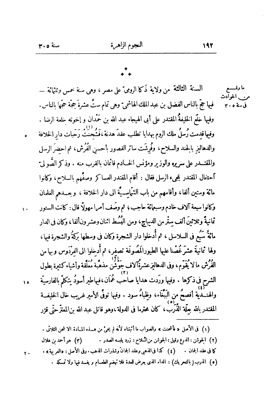 وفيها قدمت رسل ملك الروم بهدايا تطلب عقد هدنة، فشحنت «1» رحبات دار الخلافة والدهاليز بالجند والسلاح، وفرشت سائر القصور بأحسن الفرش، ثم احضر الرسل والمقتدر على سريره والوزير ومؤنس الخادم قائمان بالقرب منه. وذكر الصّولىّ احتفال المقتدر بمجيء الرسل فقال: أقام المقتدر العساكر وصفّهم بالسلاح، وكانوا مائة وستين ألفا، وأقامهم من باب الشمّاسيّة الى دار الخلافة، وبعدهم الغلمان وكانوا سبعة آلاف خادم وسبعمائة حاجب؛ ثم وصف أمرا مهولا قال: كانت الستور ثمانية وثلاثين ألف ستر من الديباج، ومن البسط اثنان وعشرون ألفا، وكان في الدار مائة سبع في السلاسل، ثم أدخلوا دار الشجرة وكان في وسطها بركة والشجرة فيها، ولها ثمانية عشر غصنا عليها الطيور المصوغة تصفر، ثم أدخلوا الى الفردوس وبها من الفرش ما لا يقوّم، وفي الدهاليز عشرة آلاف جوشن «2» مذهّبة معلّقة وأشياء كثيرة يطول الشرح في ذكرها. وفيها وردت هدايا صاحب «3» عمان، فيها طير أسود يتكلّم بالفارسيّة والهندية «4» أفصح من الببّغاء، وظباء سود. وفيها توفّى الأمير غريب خال الخليفة المقتدر بالله بعلّة الذّرب «5» ، كان محترما في الدولة، وهو قاتل عبد الله بن المعتزّ حتّى قرّر
